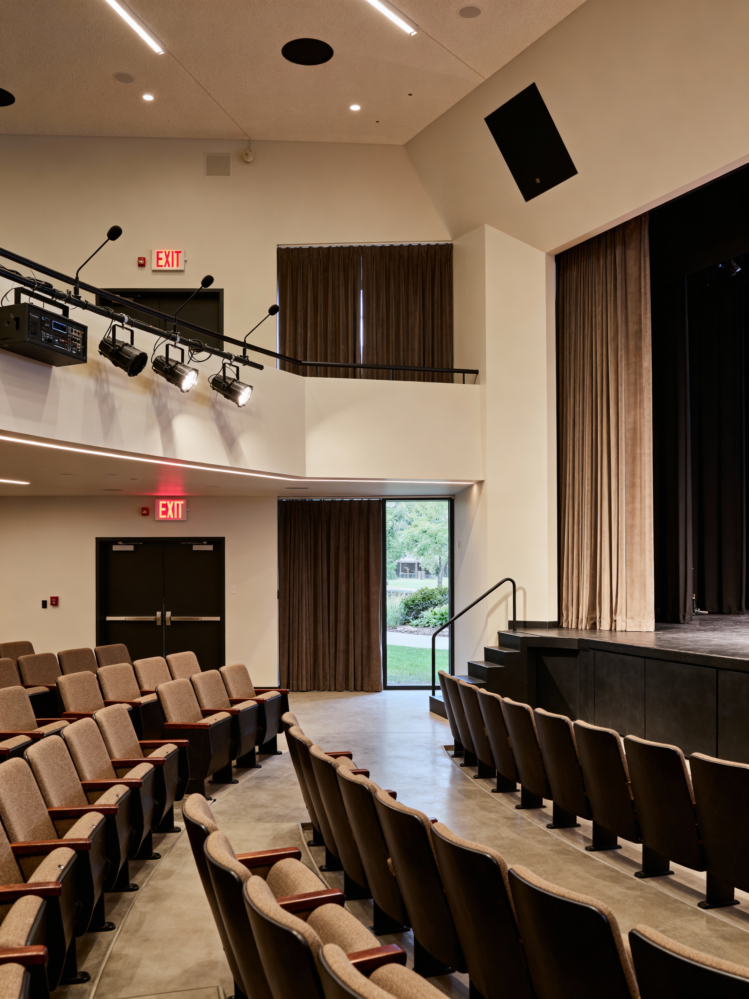 auditorium with midcentury modern style with exit signs and microphones and balcony and sound system and aisles and curtains and lighting equipment and theater seats. . with muted tones and function over form and integrating indoor and outdoor motifs and organic and geometric shapes and nature indoors and clean lines and graphic shapes and natural and manmade materials