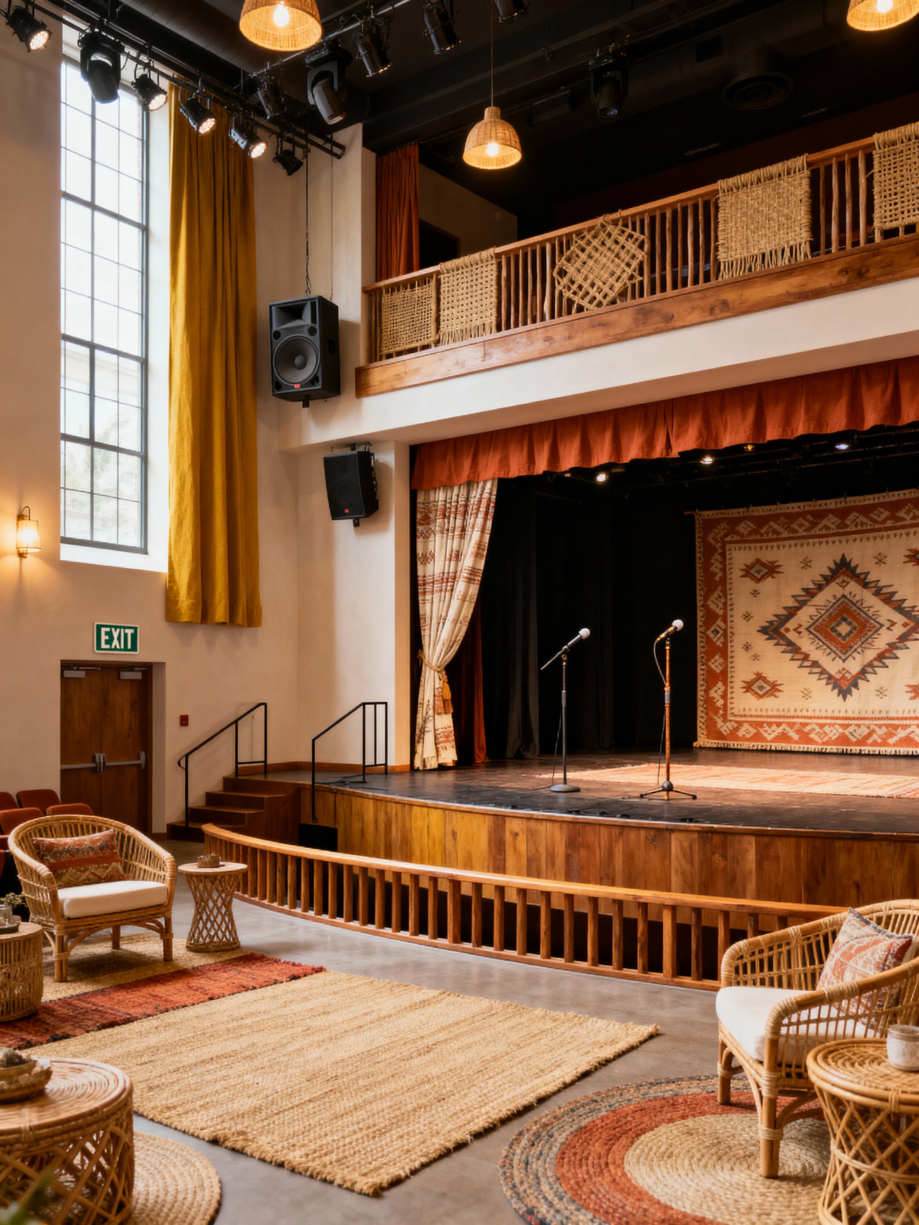 auditorium with modern boho style with sound system and orchestra pit and exit signs and microphones and curtains and lighting equipment and balcony and stage. . with warm colors and layered textures and wood decor and patterns and jute rugs and collected look and rattan furniture and cozy feel