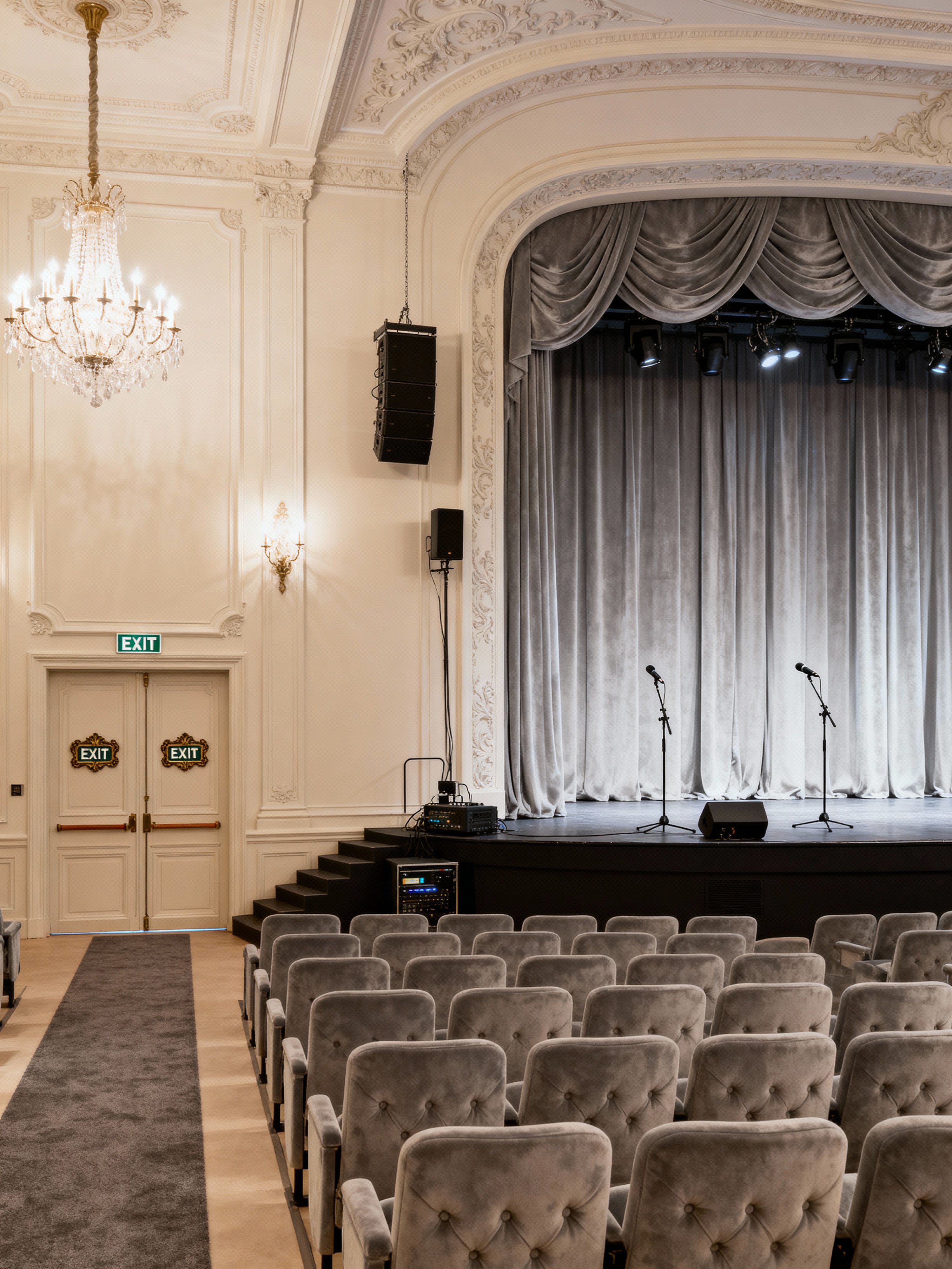 auditorium with parisian style with stage and microphones and sound system and lighting equipment and theater seats and exit signs and aisles and curtains. . with classic details and vintage pieces and sophisticated charm and timeless beauty and european flair and ornate moldings and neutral palette and chic simplicity