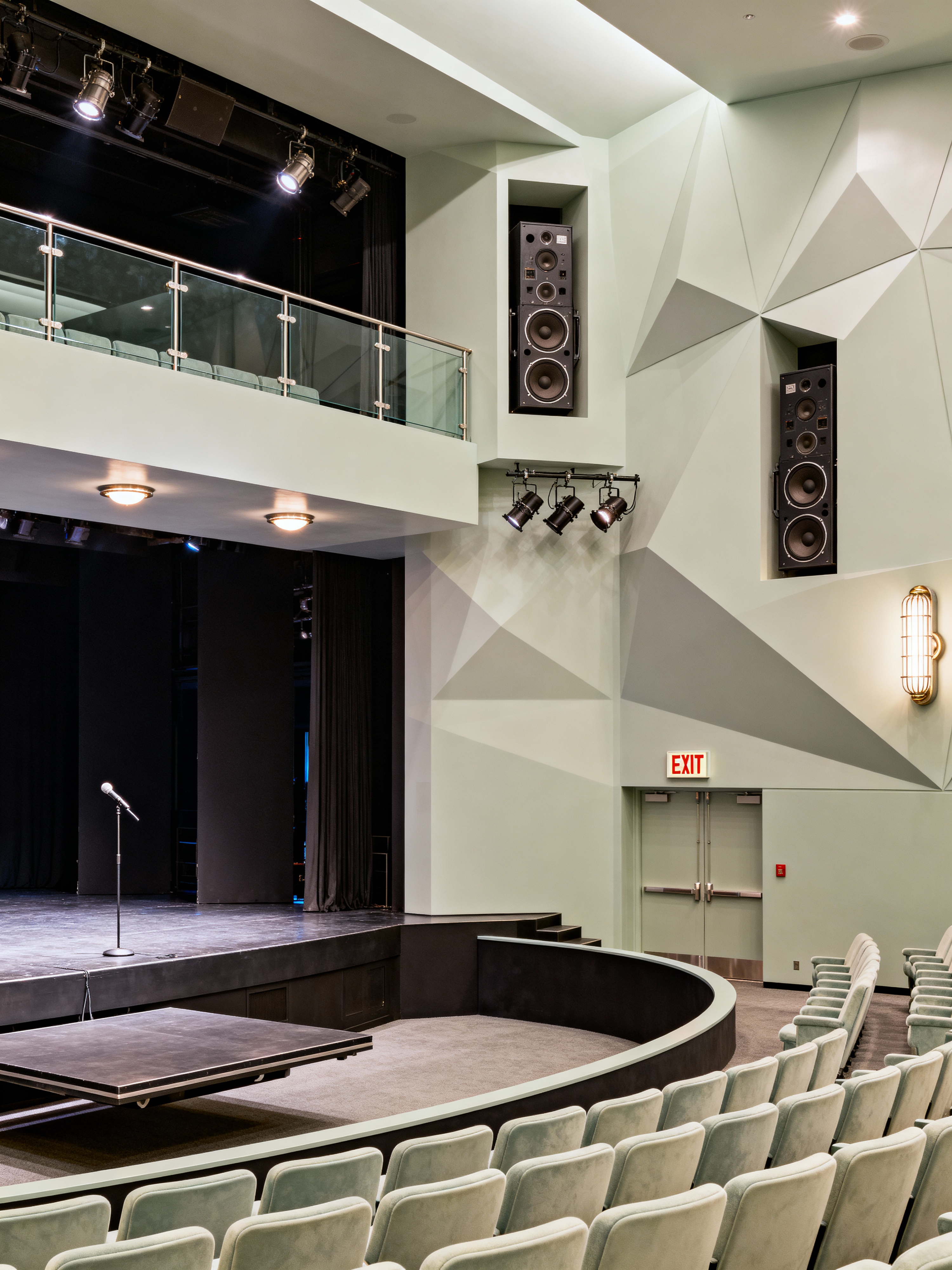 auditorium with retro futuristic style with balcony and sound system and stage and microphones and lighting equipment and theater seats and exit signs and orchestra pit. . with light colors and glass panes and floating surfaces and futuristic interior and strong geometric walls and steel finishing and futurism minimalist interior and vintage futurism