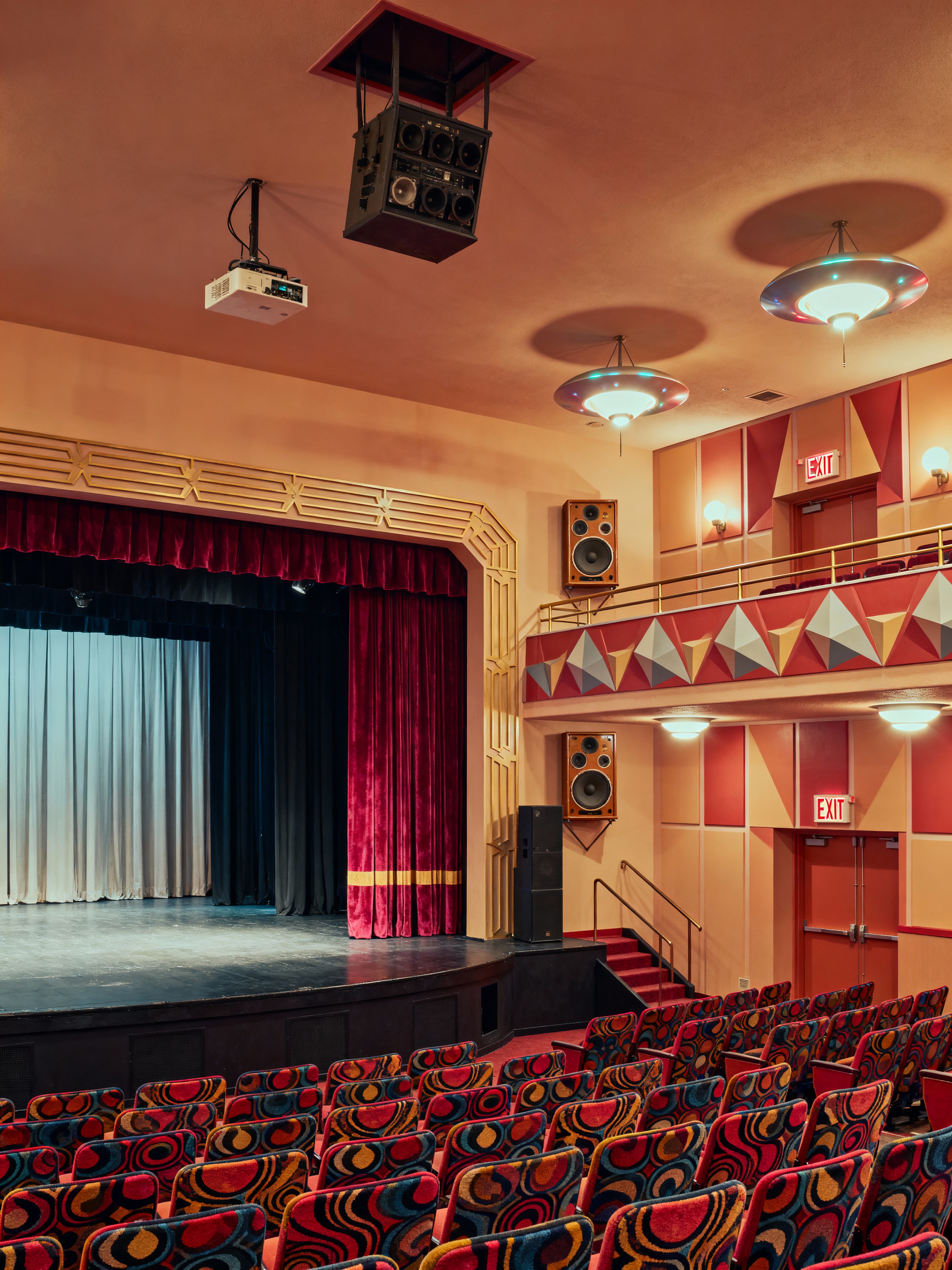 auditorium with retro style with stage and aisles and exit signs and curtains and sound system and balcony and theater seats and lighting equipment. . with mod style and groovy vibes and bold patterns and geometric shapes and space age and funky decor and nostalgic pieces and vintage revival