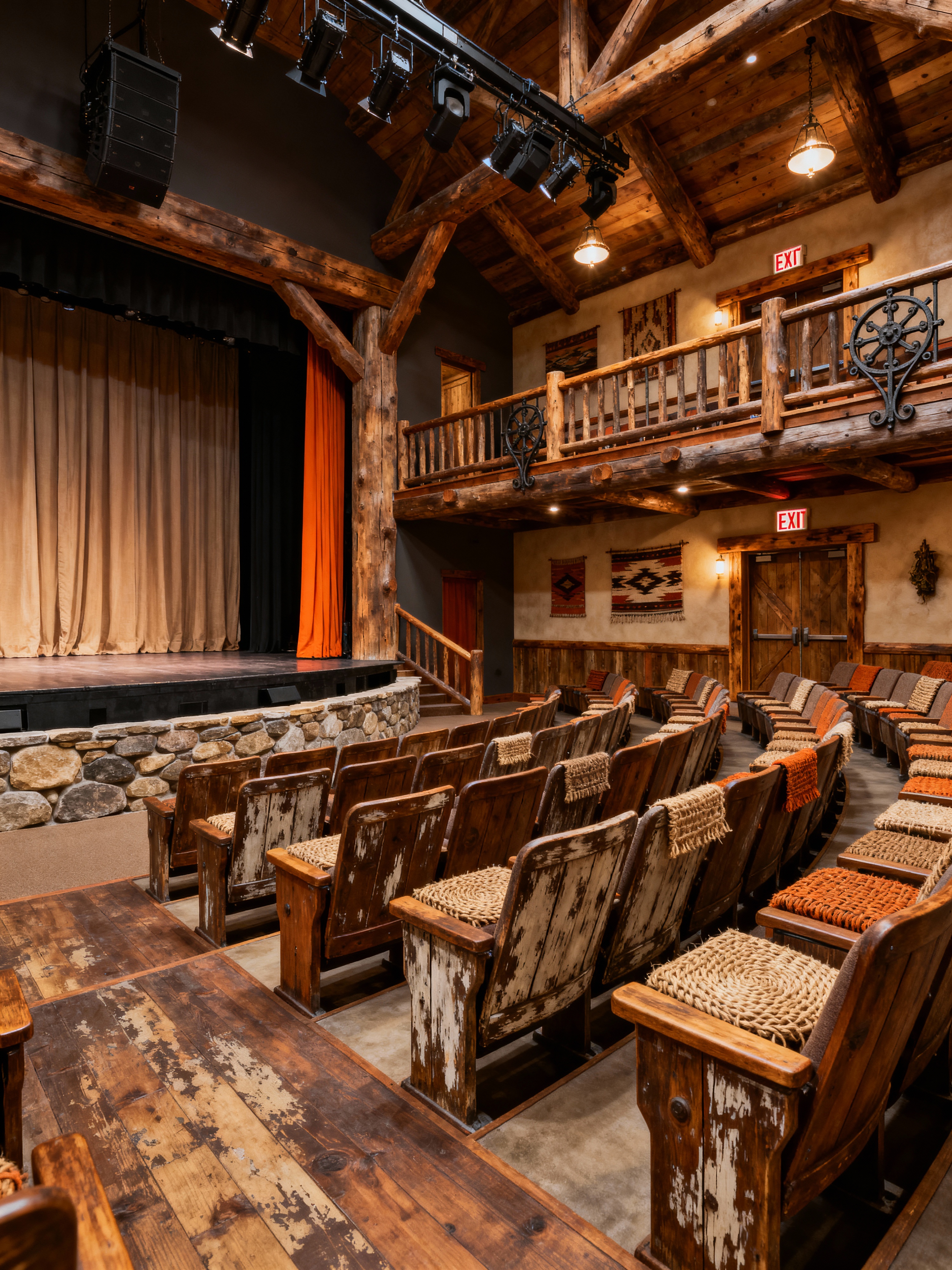 auditorium with rustic style with theater seats and lighting equipment and orchestra pit and sound system and stage and balcony and curtains and exit signs. . with stone accents and woven textures and cozy cabin and exposed beams and earthy tones and warmth and distressed finishes and iron fixtures