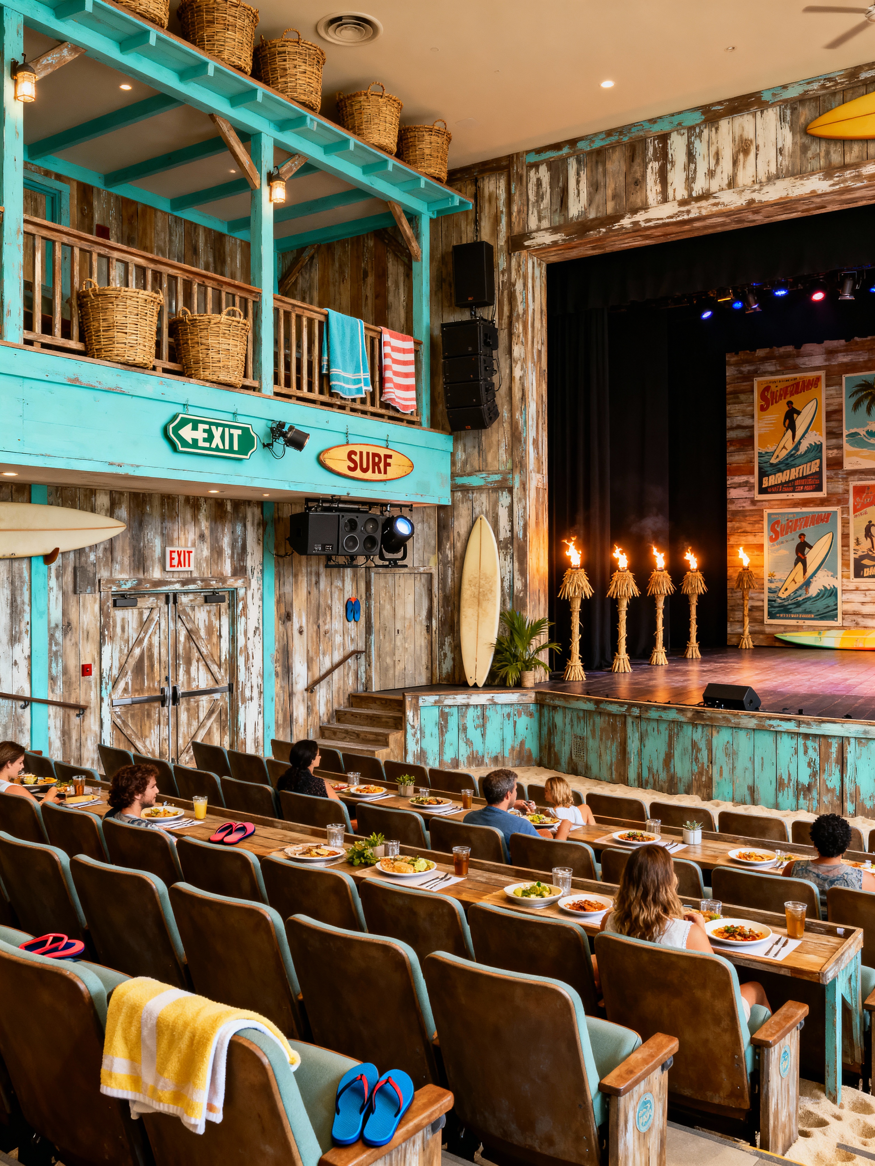 auditorium with surf shack style with balcony and aisles and exit signs and theater seats and sound system and lighting equipment and orchestra pit and stage. . with flip-flops and casual dining and tiki torches and vintage surf posters and turquoise accents and woven baskets and beach towels and weathered wood