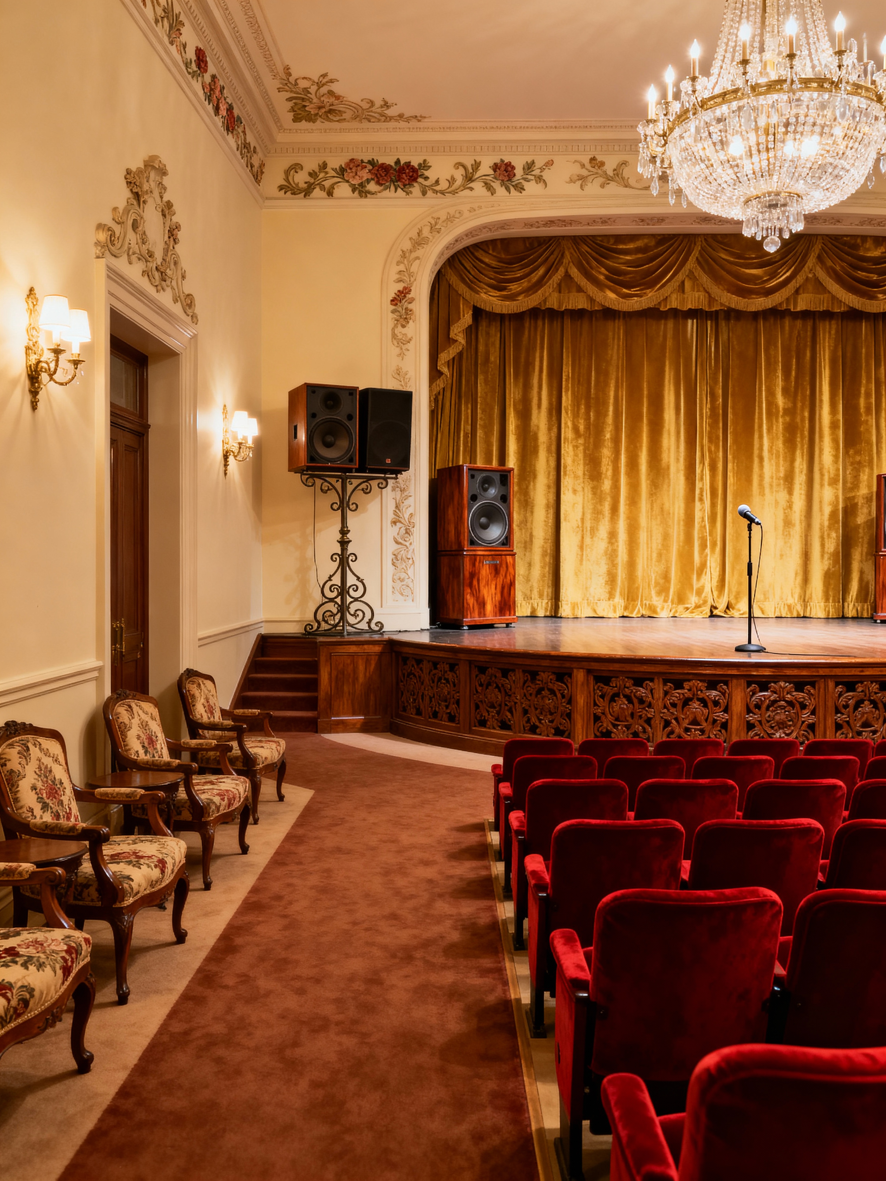 auditorium with traditional style with lighting equipment and theater seats and orchestra pit and aisles and stage and curtains and sound system and microphones. . with antique pieces and warm colors and luxurious textiles and formal furniture and ornate details and timeless design and refined atmosphere and crown molding