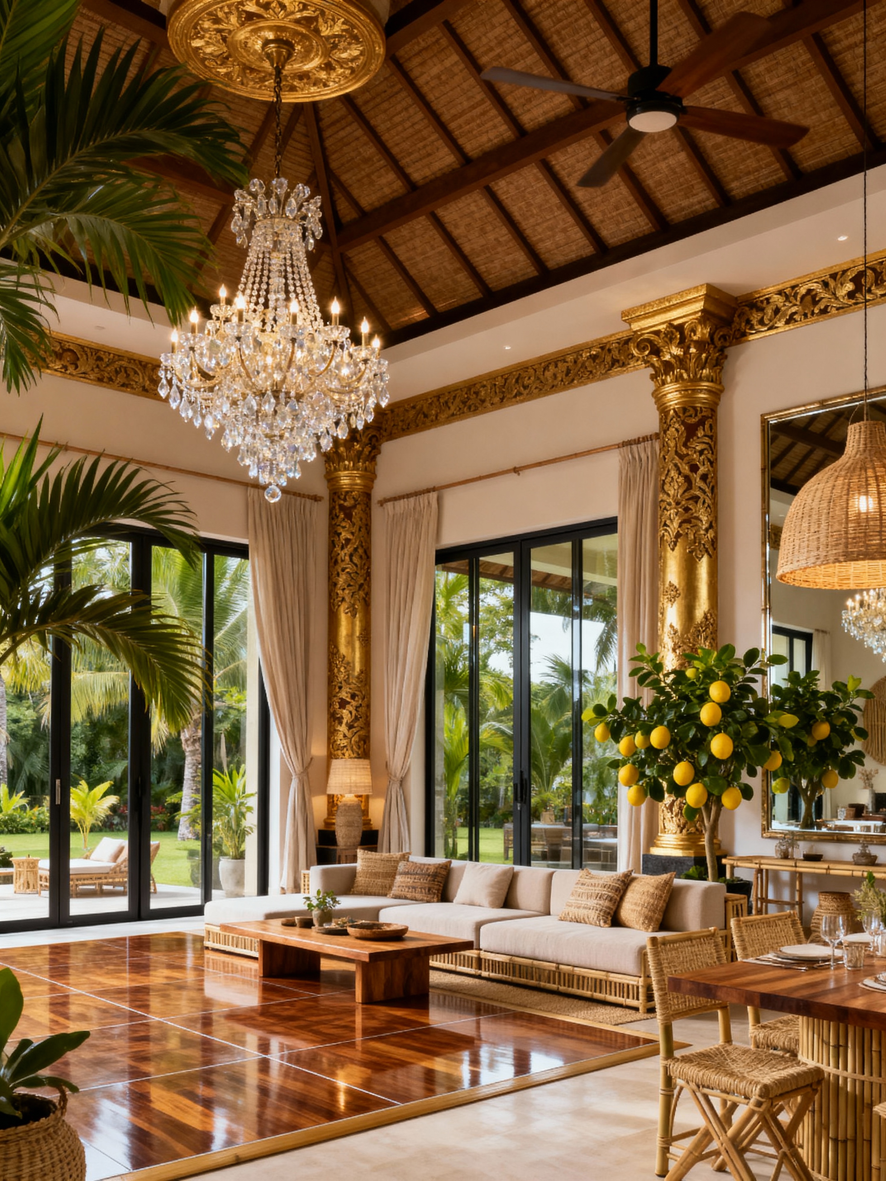 ballroom with bali style with crystal fixtures and gilded decor and ornate columns and elegant drapes and chandeliers and dance floor and mirrors and elegant seating. . with raffia or bamboo accents and low modular sofas and indoor-outdoor flow with glass doors and lush tropical plants (palms, lemon trees) and wooden coffee and dining tables and modern boho chic and woven pendant lamps and open high ceilings with fans