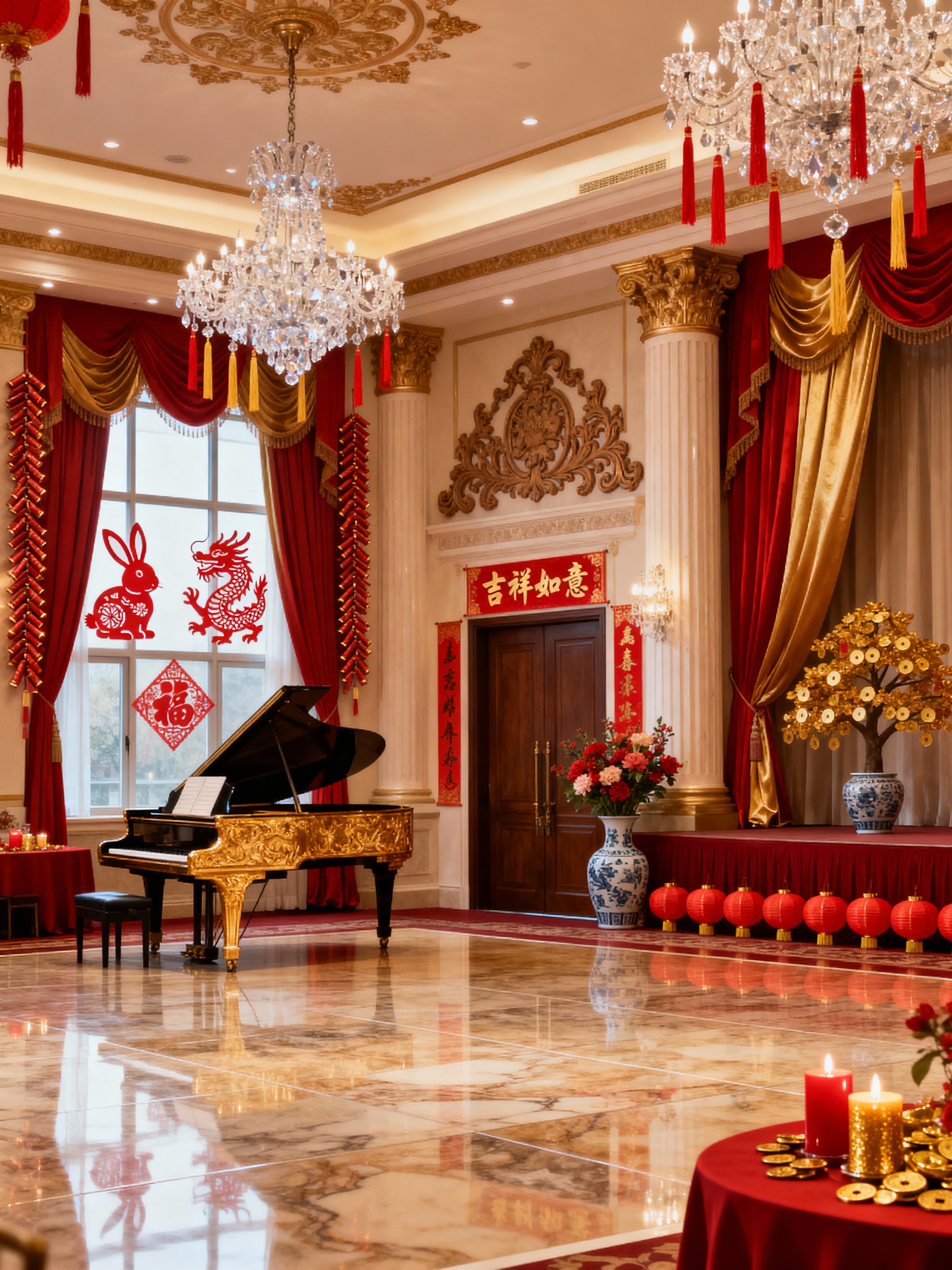ballroom with chinese new year style with dance floor and grand piano and elegant drapes and marble floors and ornate columns and chandeliers and gilded decor and crystal fixtures. . with paper firecrackers and paper cuttings and fai chun banners and red and gold tassels and mei hwa flowers and chinese red lanterns and money tree and red and gold candles