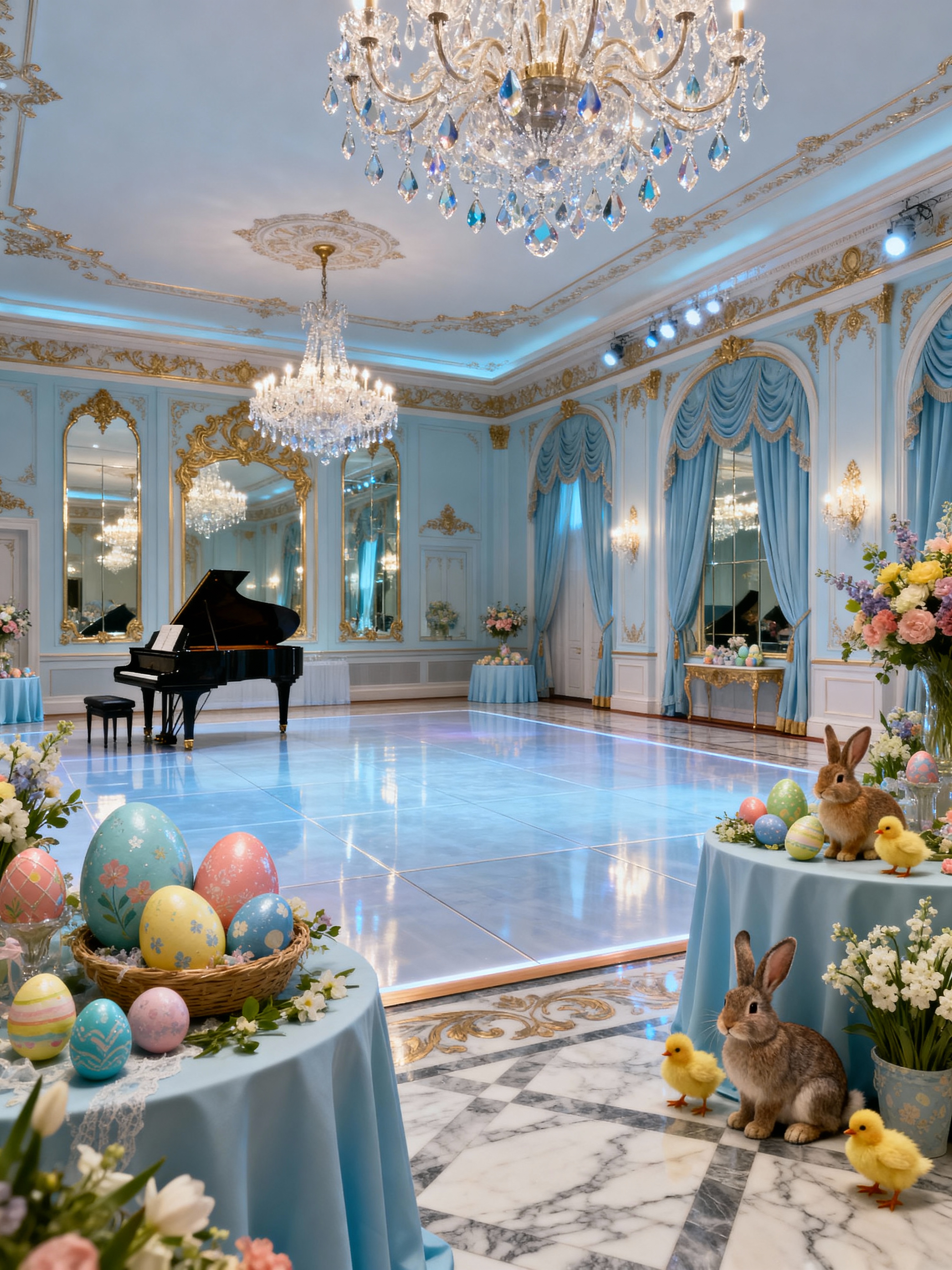 ballroom with easter style with gilded decor and mirrors and chandeliers and crystal fixtures and dance floor and elegant drapes and marble floors and grand piano. . with colorful easter eggs and easter decorations and flowers on table and light blue colors and spring decorations and colorful easter eggs