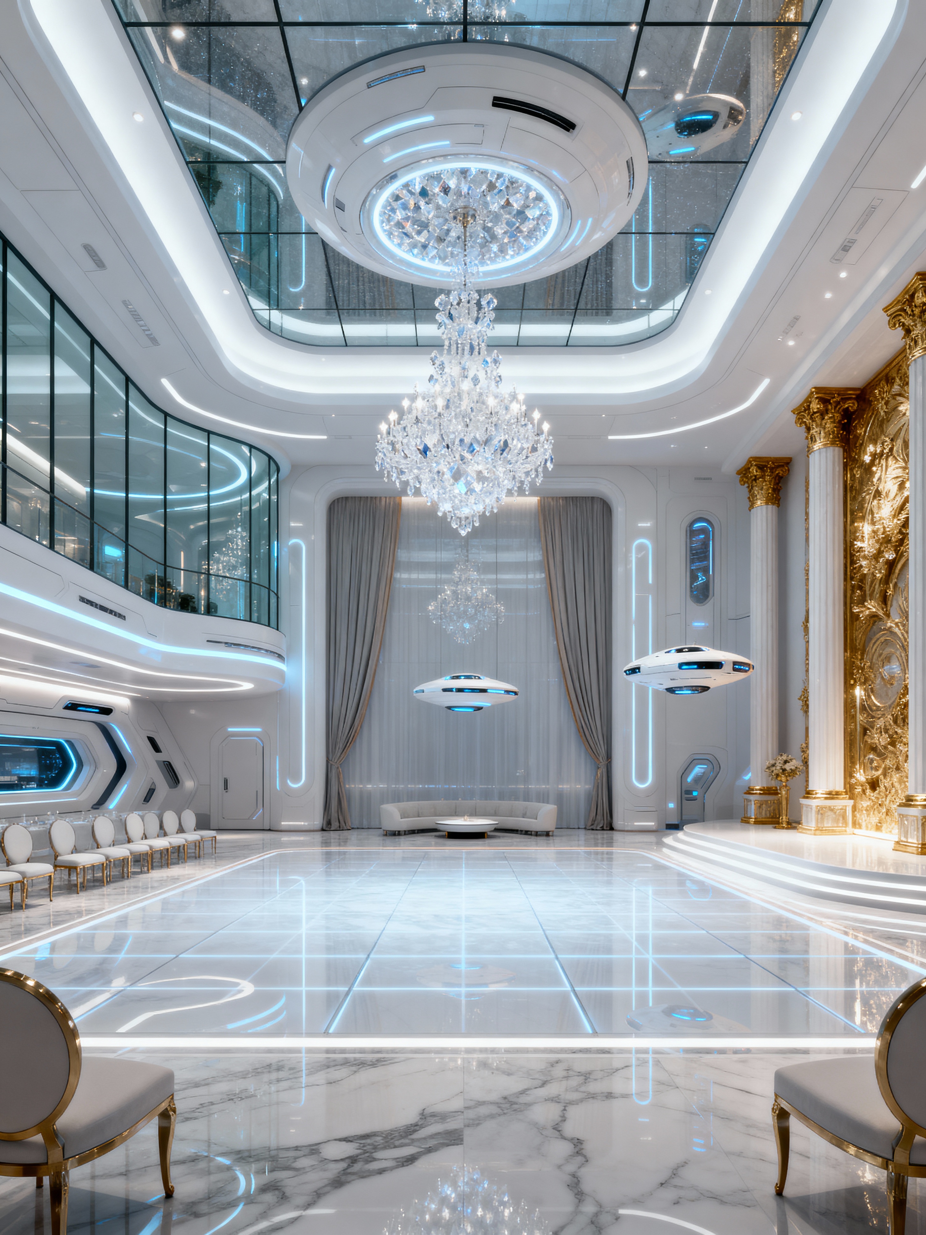 ballroom with futuristic style with dance floor and crystal fixtures and chandeliers and marble floors and elegant seating and ornate columns and gilded decor and elegant drapes. . with spaceship interior and smooth polished marble and glass panes and futurism minimalist interior and minimalist clean lines and neutral background and bright accents and futurism and floating surfaces