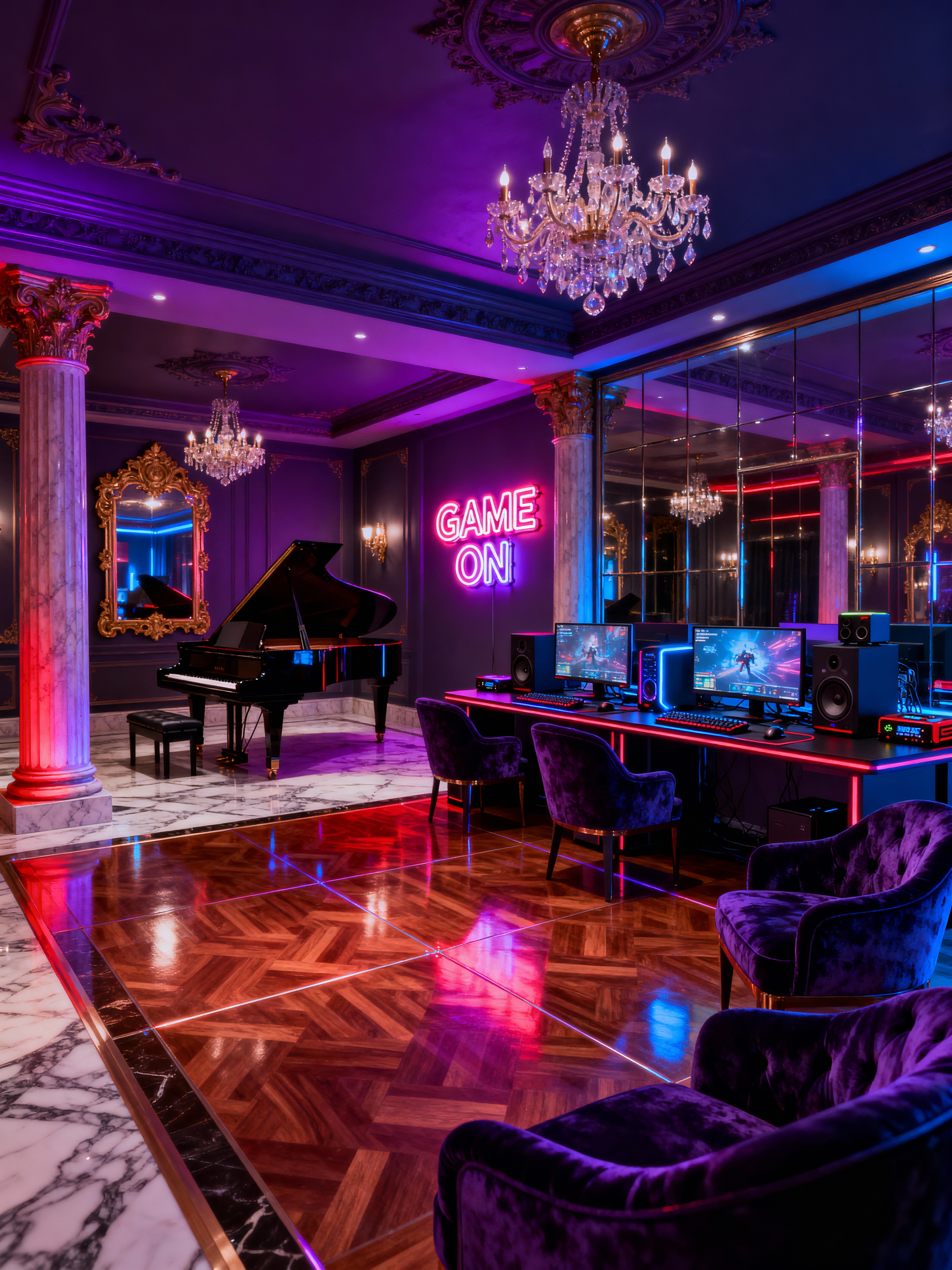 ballroom with gaming room style with ornate columns and grand piano and marble floors and mirrors and gilded decor and dance floor and chandeliers and elegant seating. . with computer desk with computer displays and keyboard and speakers and purple, red and blue fade light and purple and red lights and dark lit room and video game consoles and multiple displays and neon letters on wall