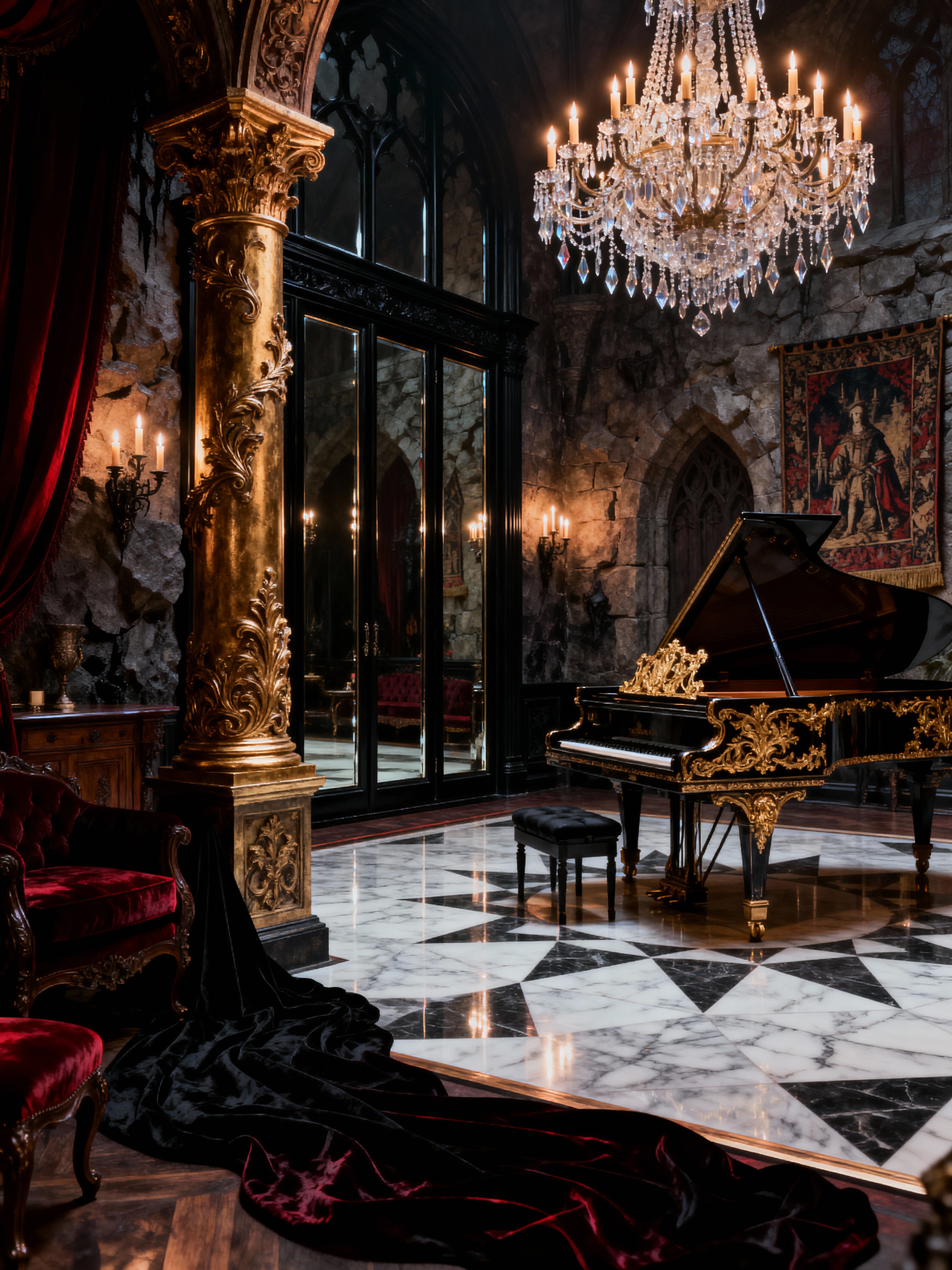 ballroom with gothic style with gilded decor and dance floor and ornate columns and crystal fixtures and grand piano and chandeliers and elegant drapes and mirrors. . with candlelit ambiance and ornate details and dark colors and heavy furniture and mysterious mood and medieval influence and stone textures and dramatic atmosphere