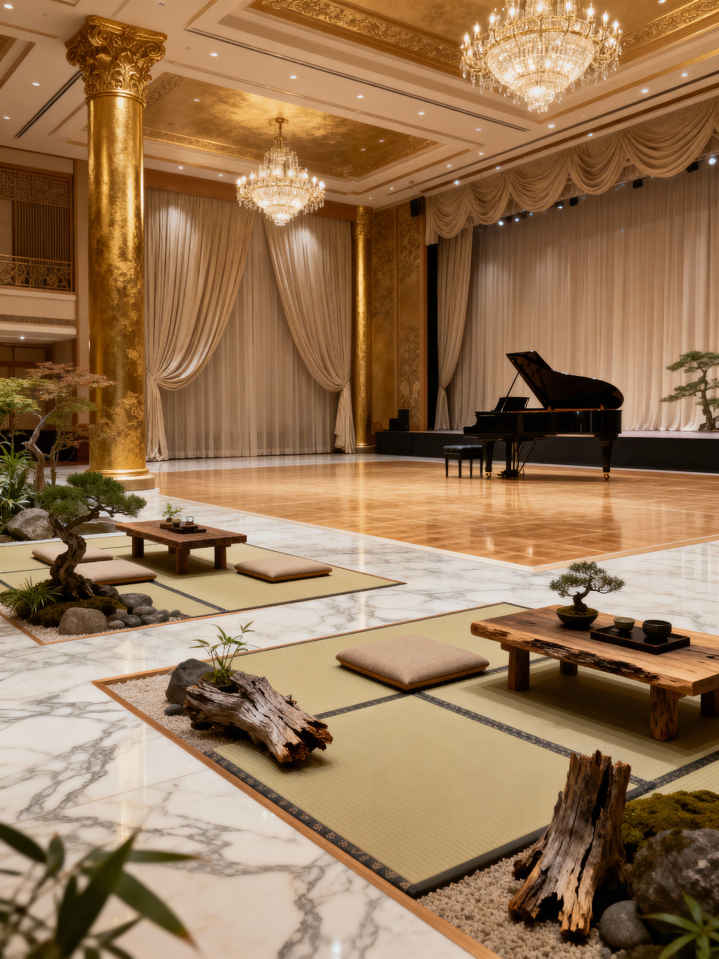 ballroom with japanese design style with gilded decor and elegant seating and grand piano and elegant drapes and dance floor and marble floors and ornate columns and chandeliers. . with low furniture and minimalism and indoor plants and natural materials and zen decor and tatami mats and wabi-sabi and tranquility