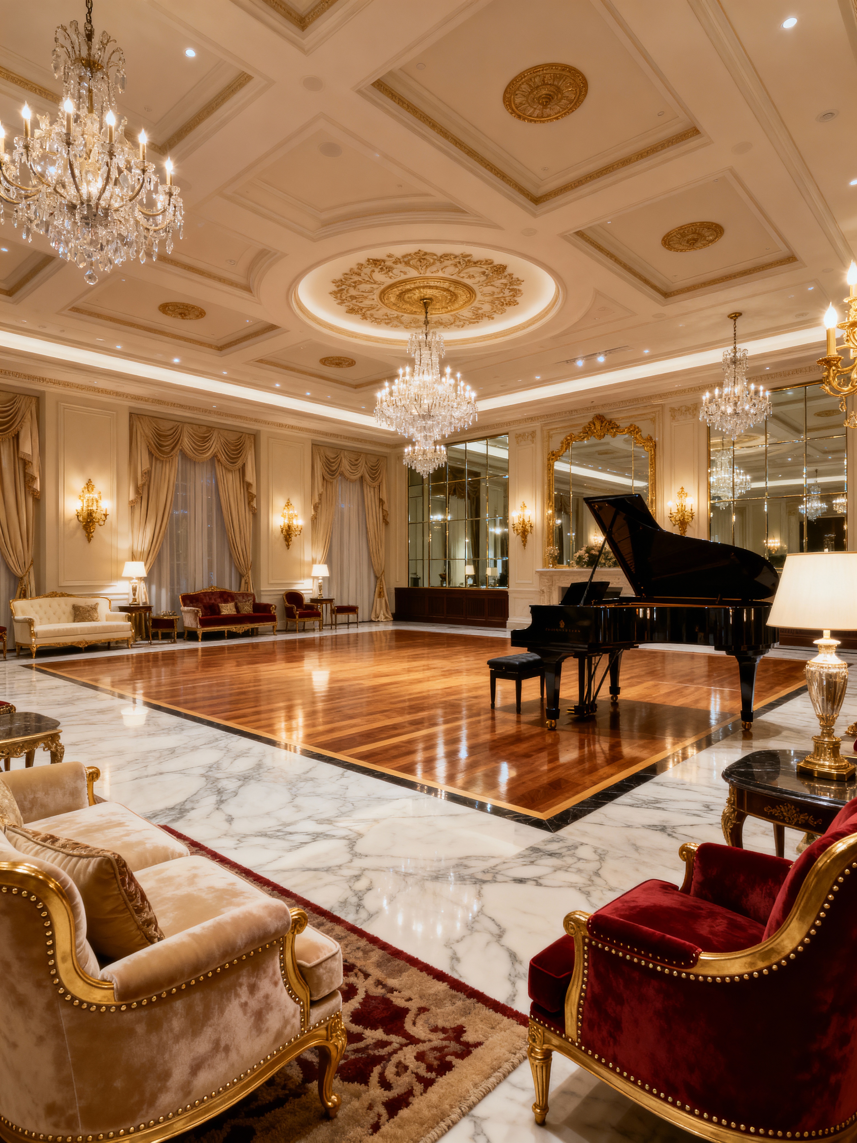 ballroom with luxury style with elegant seating and grand piano and gilded decor and chandeliers and crystal fixtures and marble floors and dance floor and mirrors. . with exclusive design and lavish comfort and premium finishes and high-end materials and rich textures and sophisticated style and custom pieces and elegant lighting
