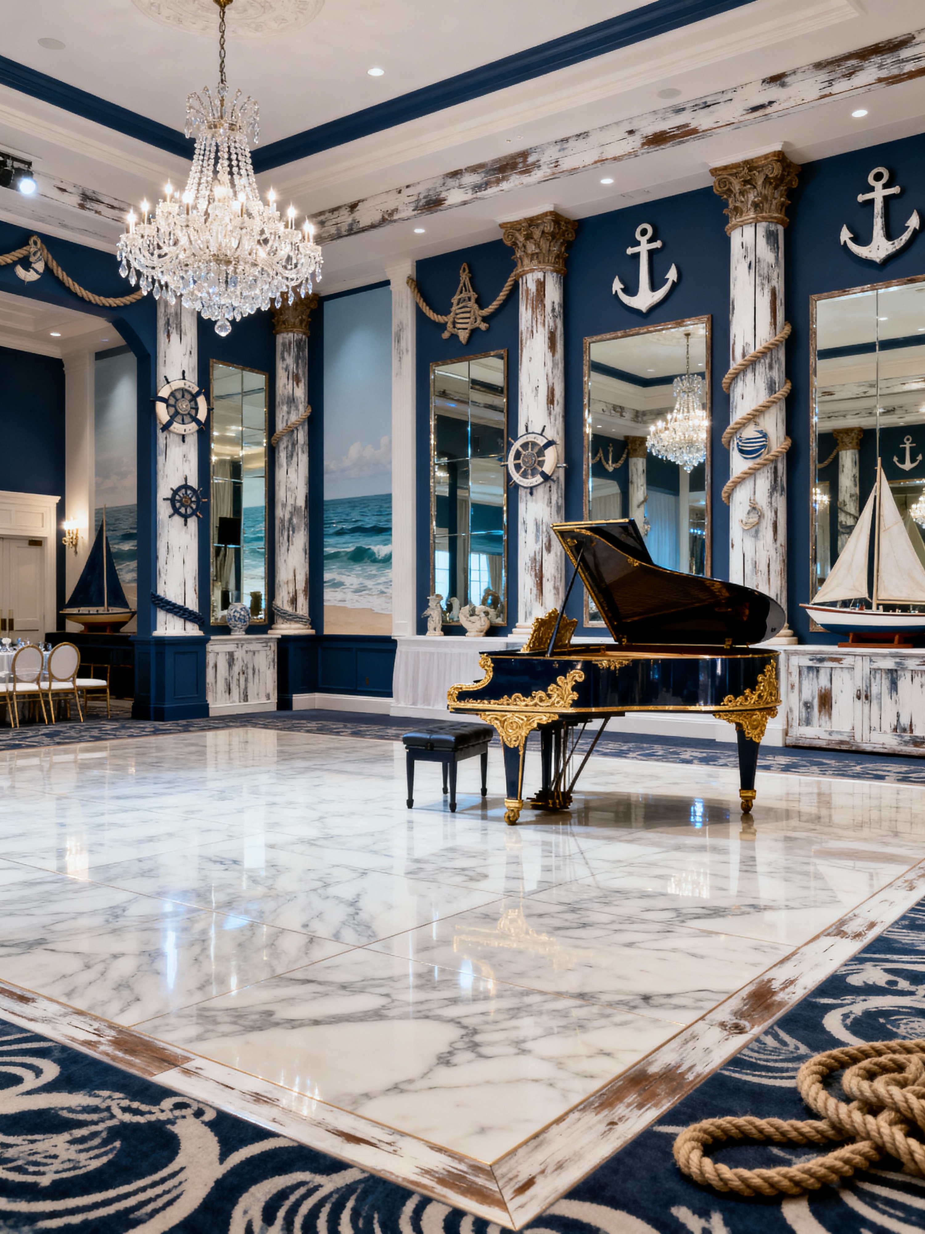 ballroom with nautical style with dance floor and marble floors and grand piano and gilded decor and crystal fixtures and chandeliers and ornate columns and mirrors. . with navy blue and rope details and ocean inspiration and sailboat elements and coastal vibes and maritime decor and anchor motifs and weathered wood