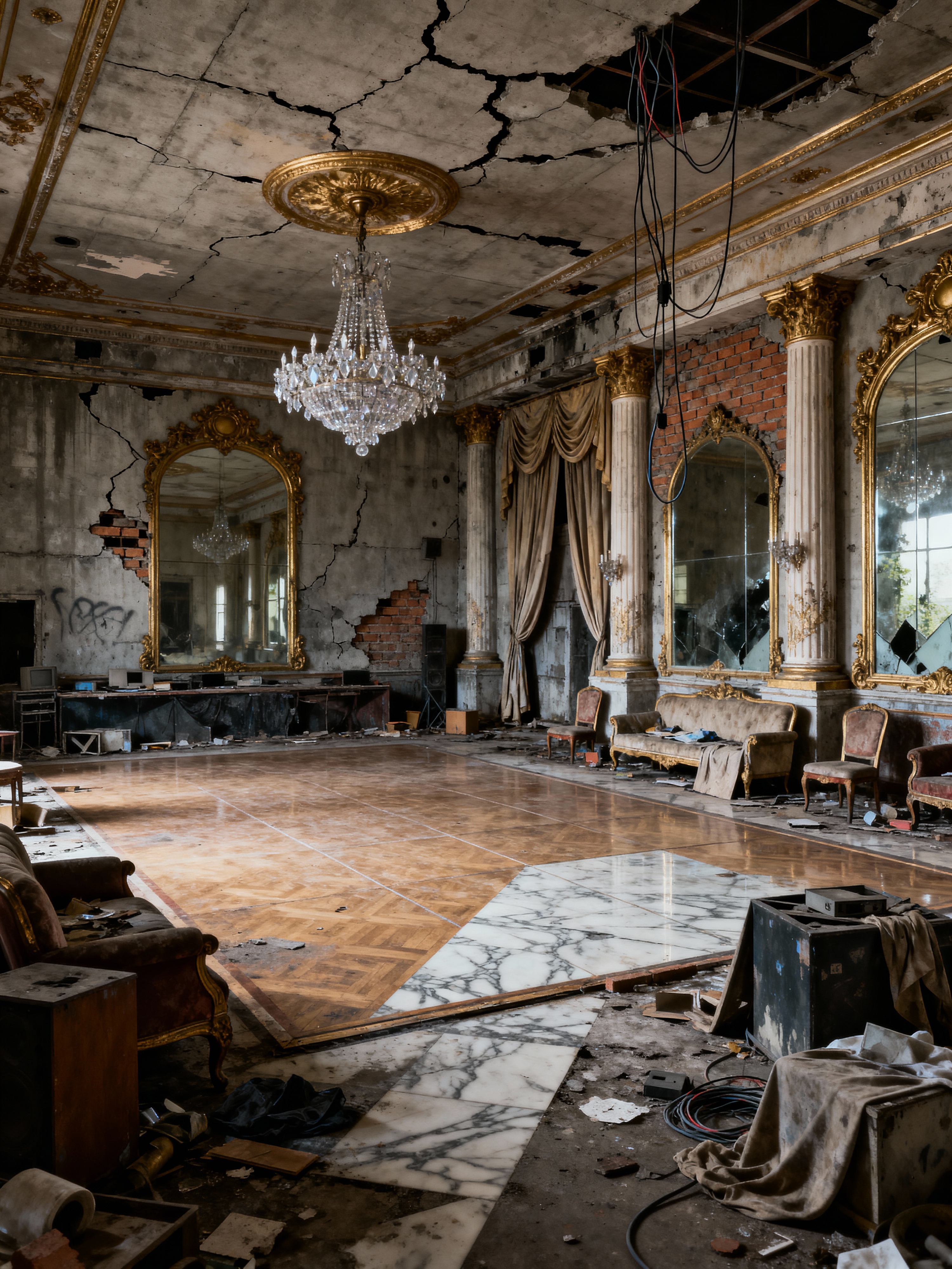ballroom with post-apocalyptic style with dance floor and gilded decor and elegant seating and crystal fixtures and ornate columns and mirrors and marble floors and elegant drapes. . with cracked concrete walls and run-down favela style and exposed bricks and makeshift furniture and hanging exposed wires and worn textures and post-apocalyptic and clutter