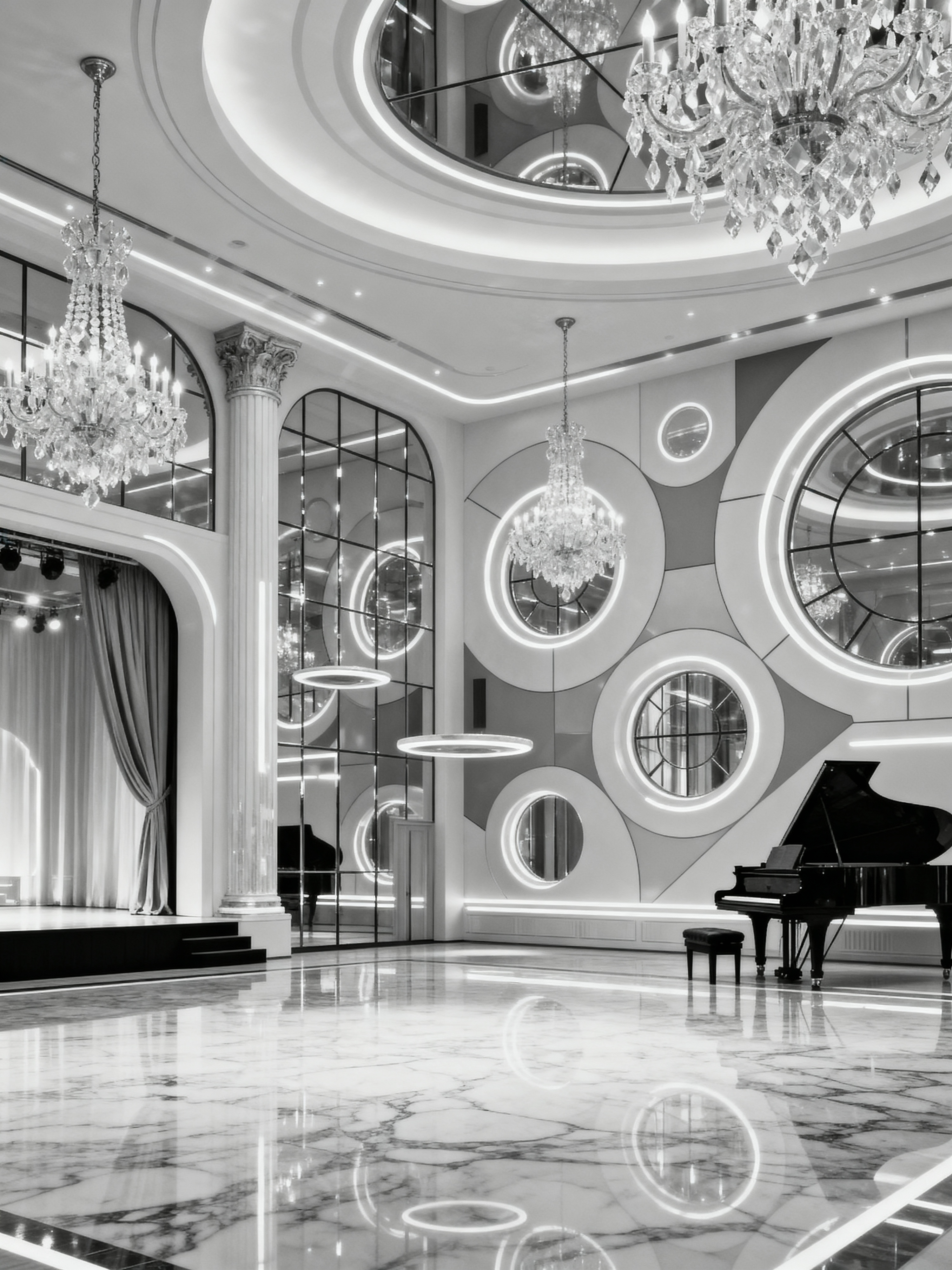 ballroom with retro futuristic style with crystal fixtures and dance floor and mirrors and ornate columns and elegant drapes and marble floors and chandeliers and grand piano. . with floating surfaces and vintage futurism and monochromatic palette and glass panes and futuristic interior and strong geometric walls and circular shapes and light colors