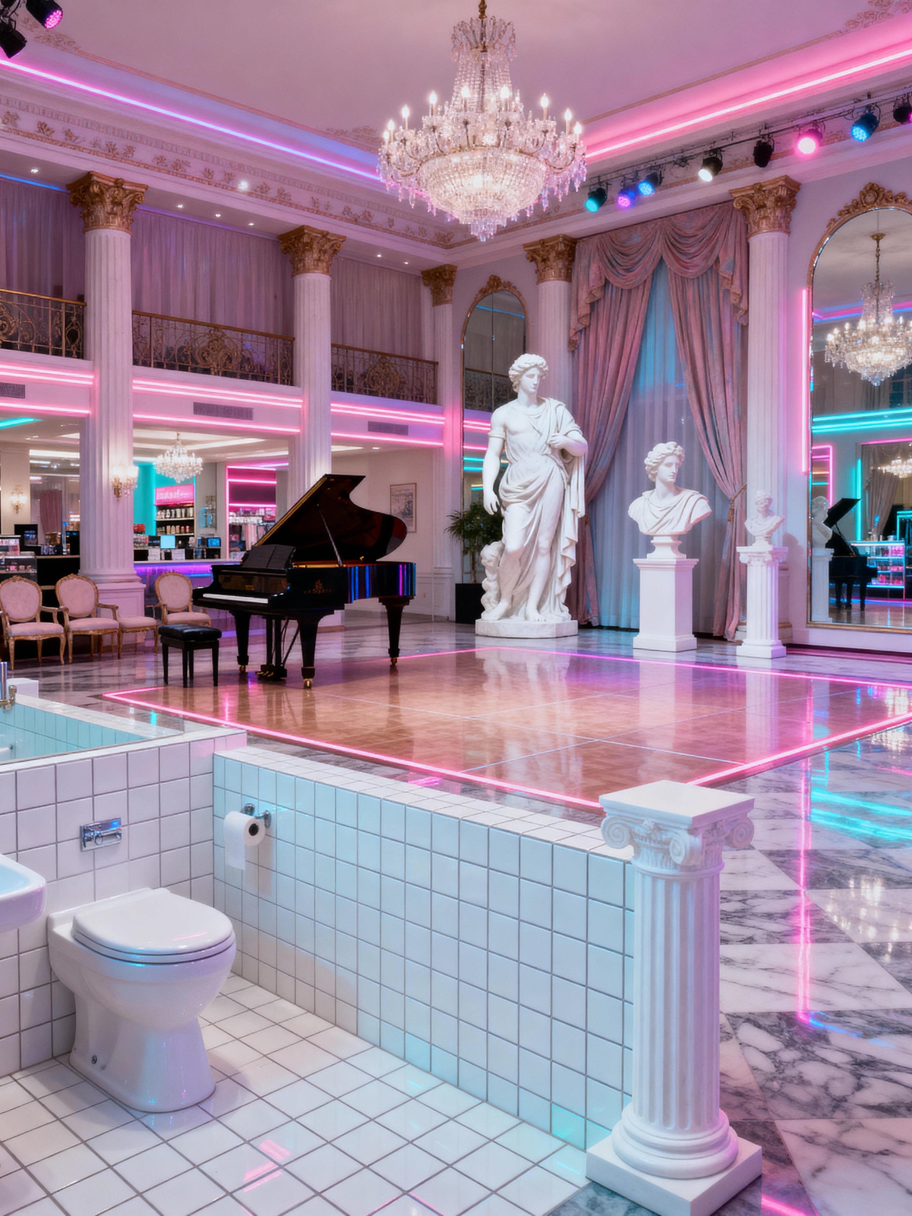 ballroom with vaporwave style with grand piano and ornate columns and chandeliers and elegant seating and dance floor and elegant drapes and marble floors and mirrors. . with 1980s retail shops and neon glow and washed out colors and white square bathroom tiles and white square bathroom tiles and white square bathroom tiles and white roman statues, white roman sculptures, white roman columns, white roman pillars in the center of the room, and white roman statues, white roman sculptures, white roman columns, white roman pillars in the center of the room,