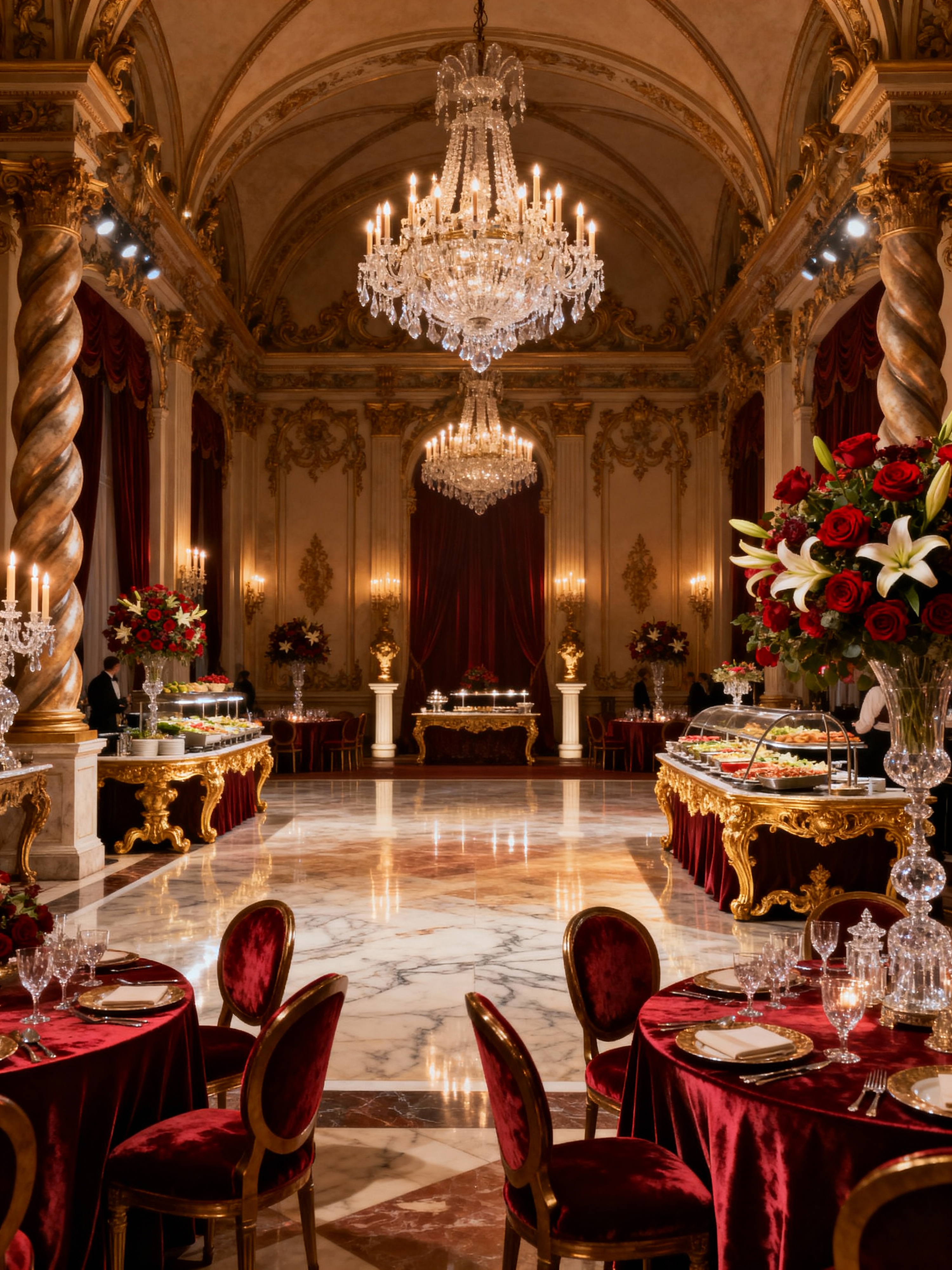 banquet hall with baroque style with elegant decor and dance floor and chandeliers and tablecloths and round tables and buffet tables and centerpieces and floral arrangements. . with expensive and plush flooring and twisted columns and dynamism and pedestal feet and grandeur and tension and crystal and glass accents and heavy moldings