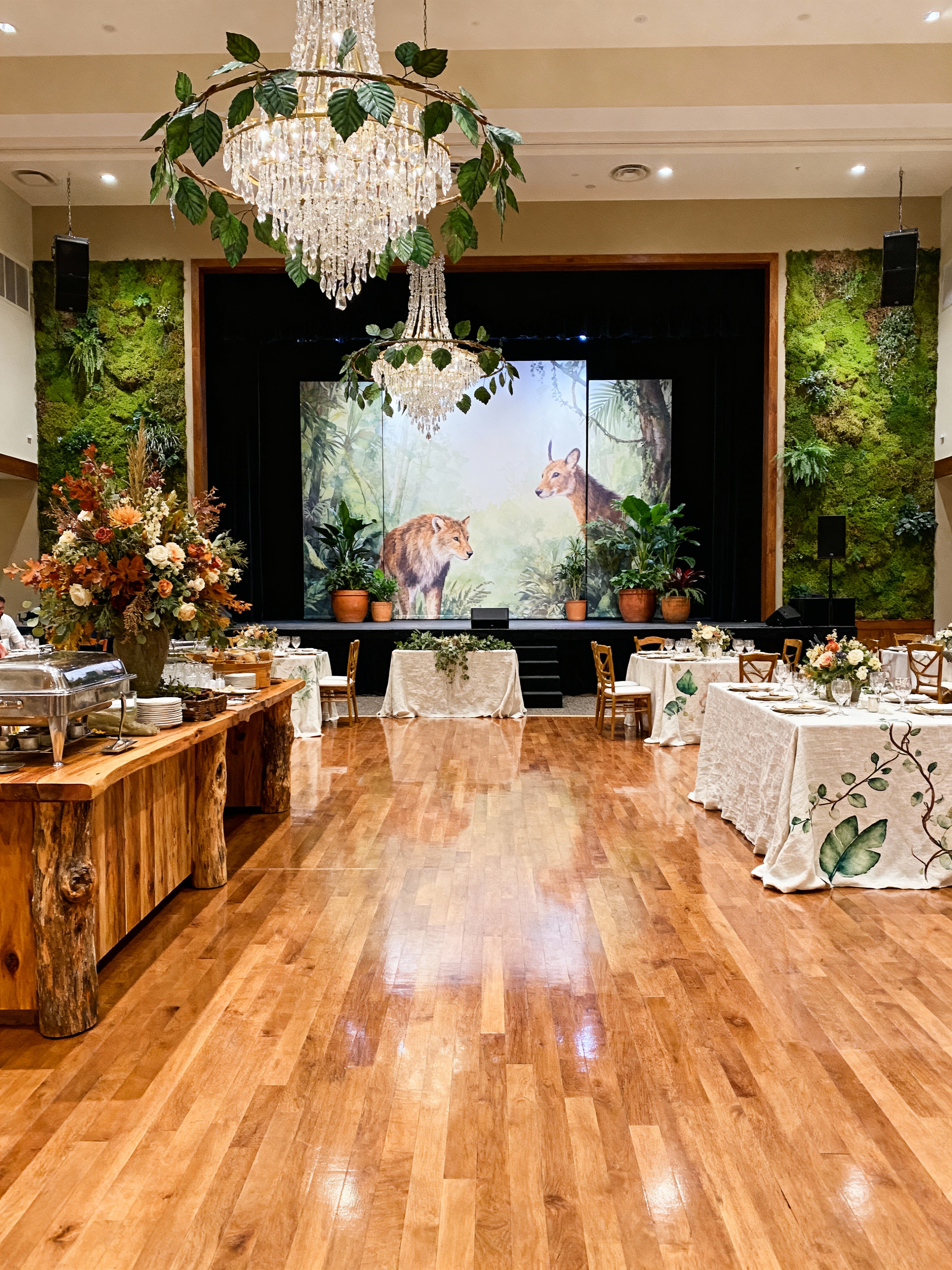 banquet hall with biophilic style with elegant decor and dance floor and buffet tables and centerpieces and chandeliers and stage and tablecloths and floral arrangements. . with linen materials and images of nature and wood materials and features of nature and images of animals and natural patterns and calming style and natural environment