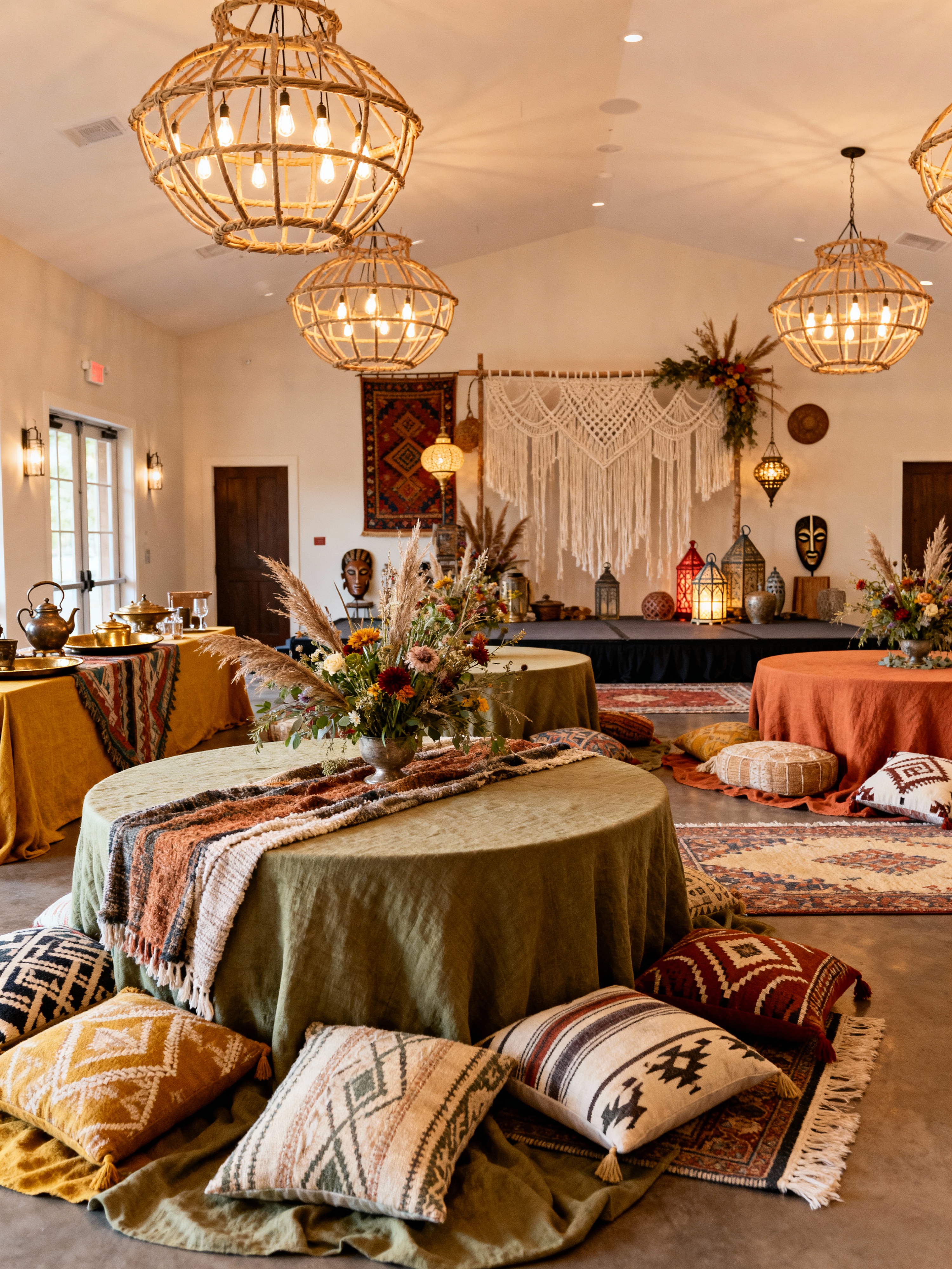 banquet hall with boho-chic style with chandeliers and floral arrangements and stage and buffet tables and round tables and elegant decor and tablecloths and centerpieces. . with earthy colors and relaxed atmosphere and vintage finds and global artifacts and free-spirited and layered textiles and mixed patterns and bohemian flair