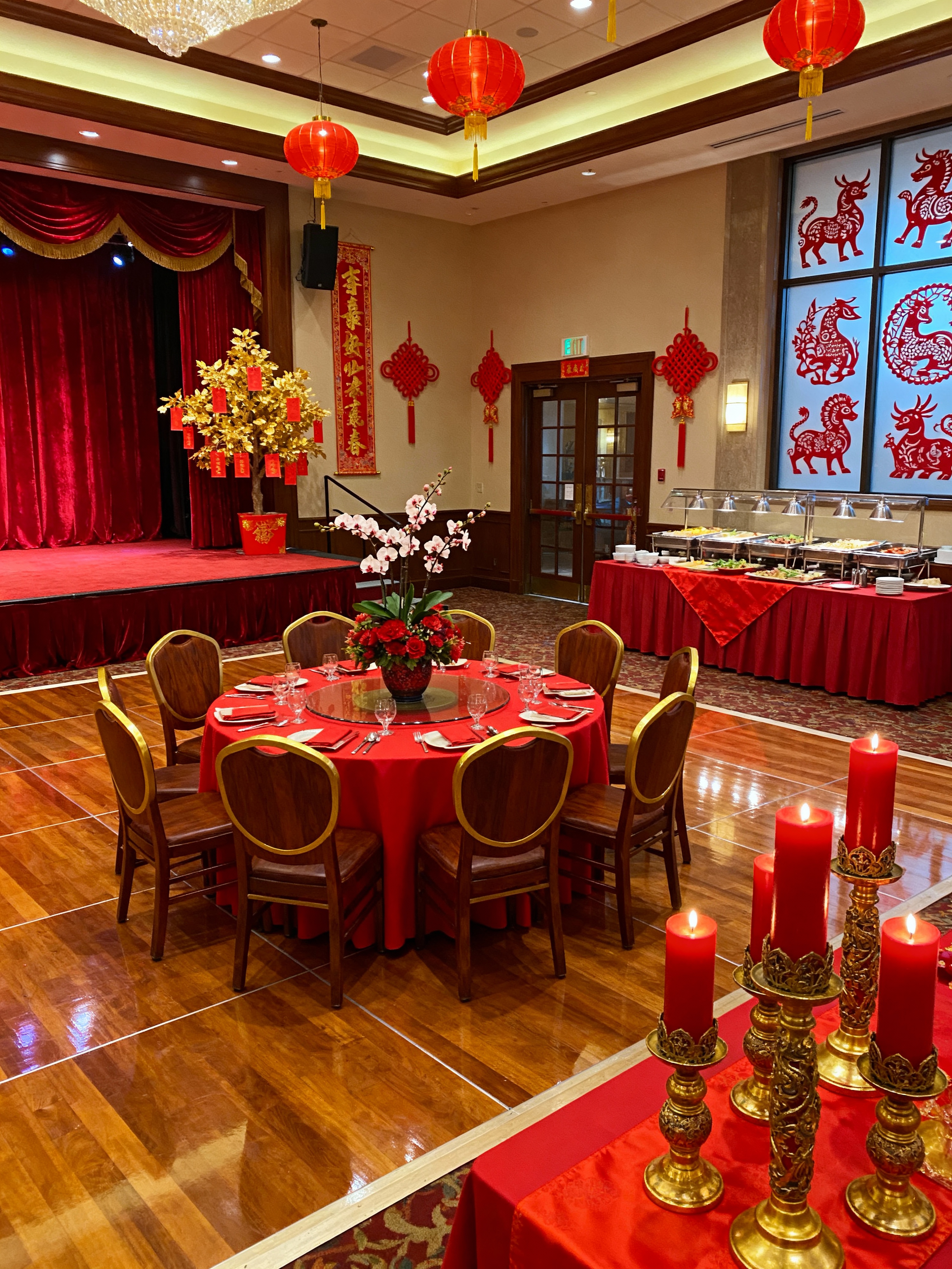banquet hall with chinese new year style with stage and elegant chairs and tablecloths and dance floor and elegant decor and round tables and centerpieces and buffet tables. . with mei hwa flowers and chinese red lanterns and red and gold candles and vases of plum blossoms and orchids and chinese knots and fai chun banners and paper cuttings and money tree