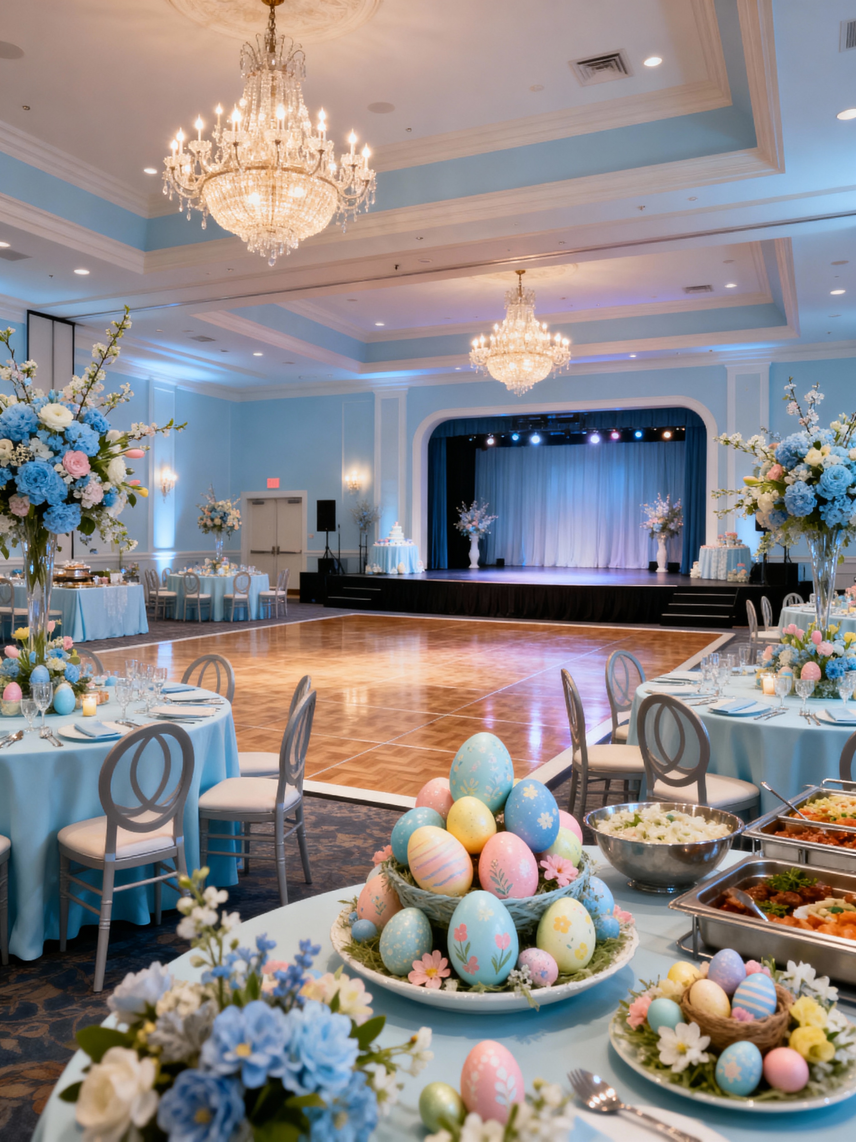 banquet hall with easter style with centerpieces and elegant decor and floral arrangements and dance floor and stage and round tables and buffet tables and chandeliers. . with spring decorations and easter decorations and colorful easter eggs and flowers on table and light blue colors and spring decorations
