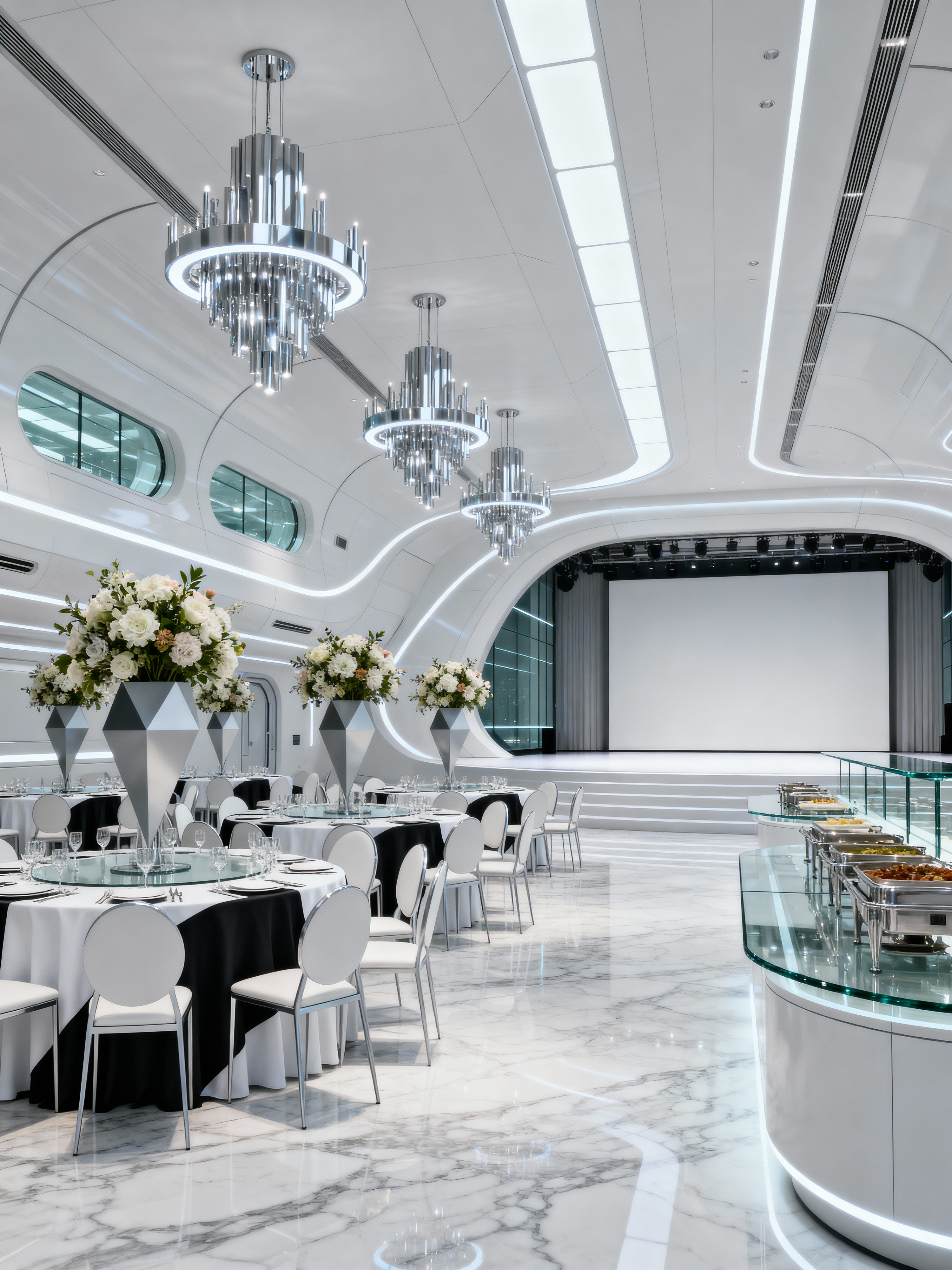 banquet hall with futuristic style with round tables and floral arrangements and tablecloths and chandeliers and buffet tables and elegant chairs and centerpieces and stage. . with futurism minimalist interior and futuristic interior and minimalist clean lines and monochromatic palette and spaceship interior and glass panes and neutral background and bright accents and smooth marble