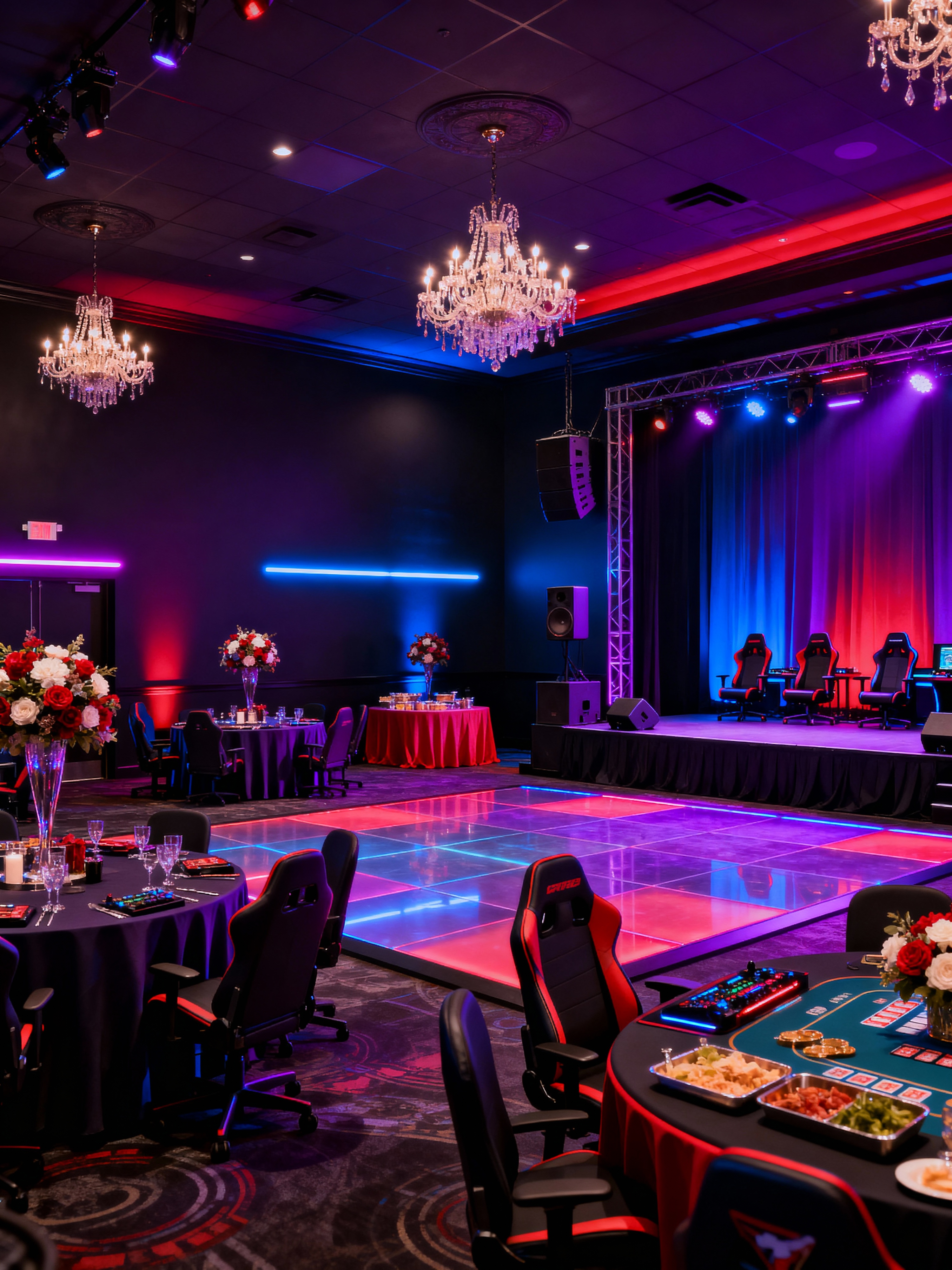 banquet hall with gaming room style with chandeliers and tablecloths and floral arrangements and centerpieces and dance floor and buffet tables and elegant decor and stage. . with dark walls and neon lights and dark lit room and gaming chair and purple, red and blue fade light and speakers and at night and dark room