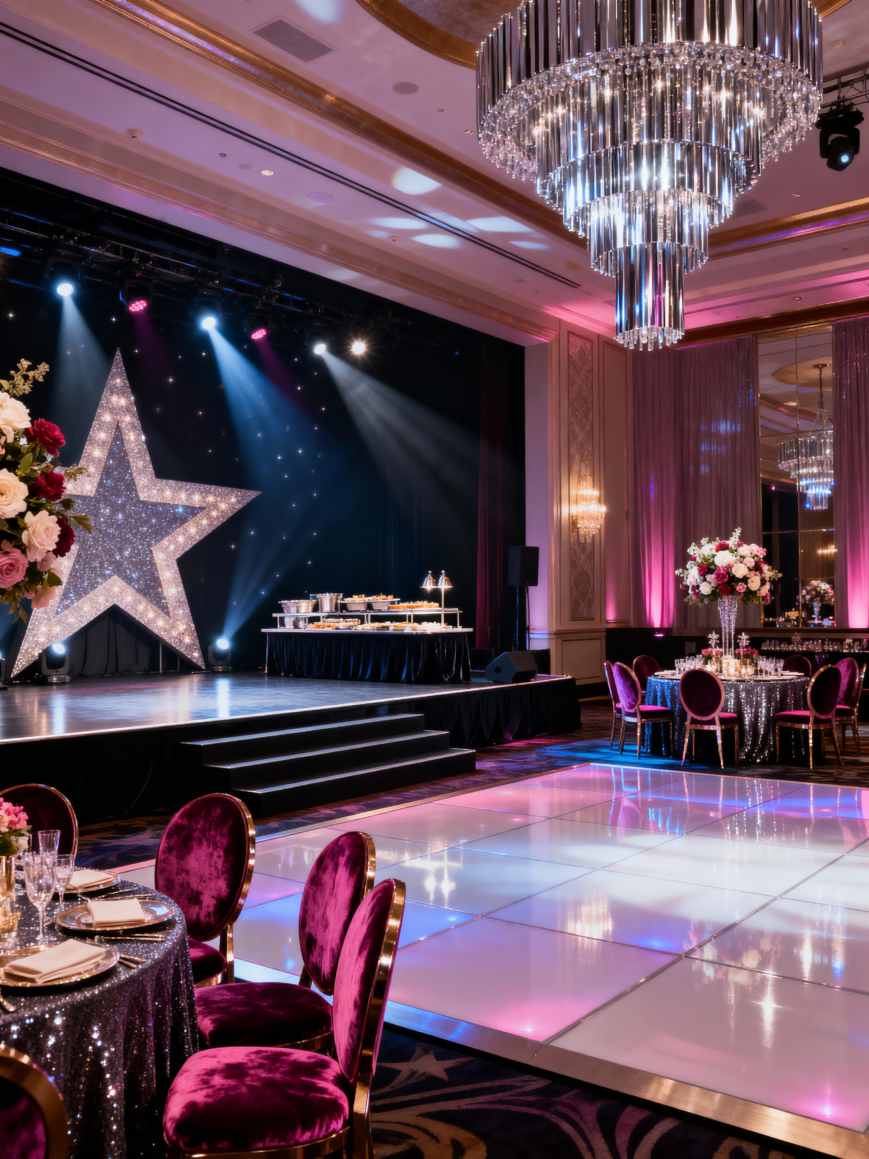 banquet hall with hollywood glam style with elegant chairs and buffet tables and stage and centerpieces and dance floor and floral arrangements and round tables and chandeliers. . with metallic accents and dramatic lighting and velvet upholstery and star quality and luxurious fabrics and glamorous style and bold colors and opulent details
