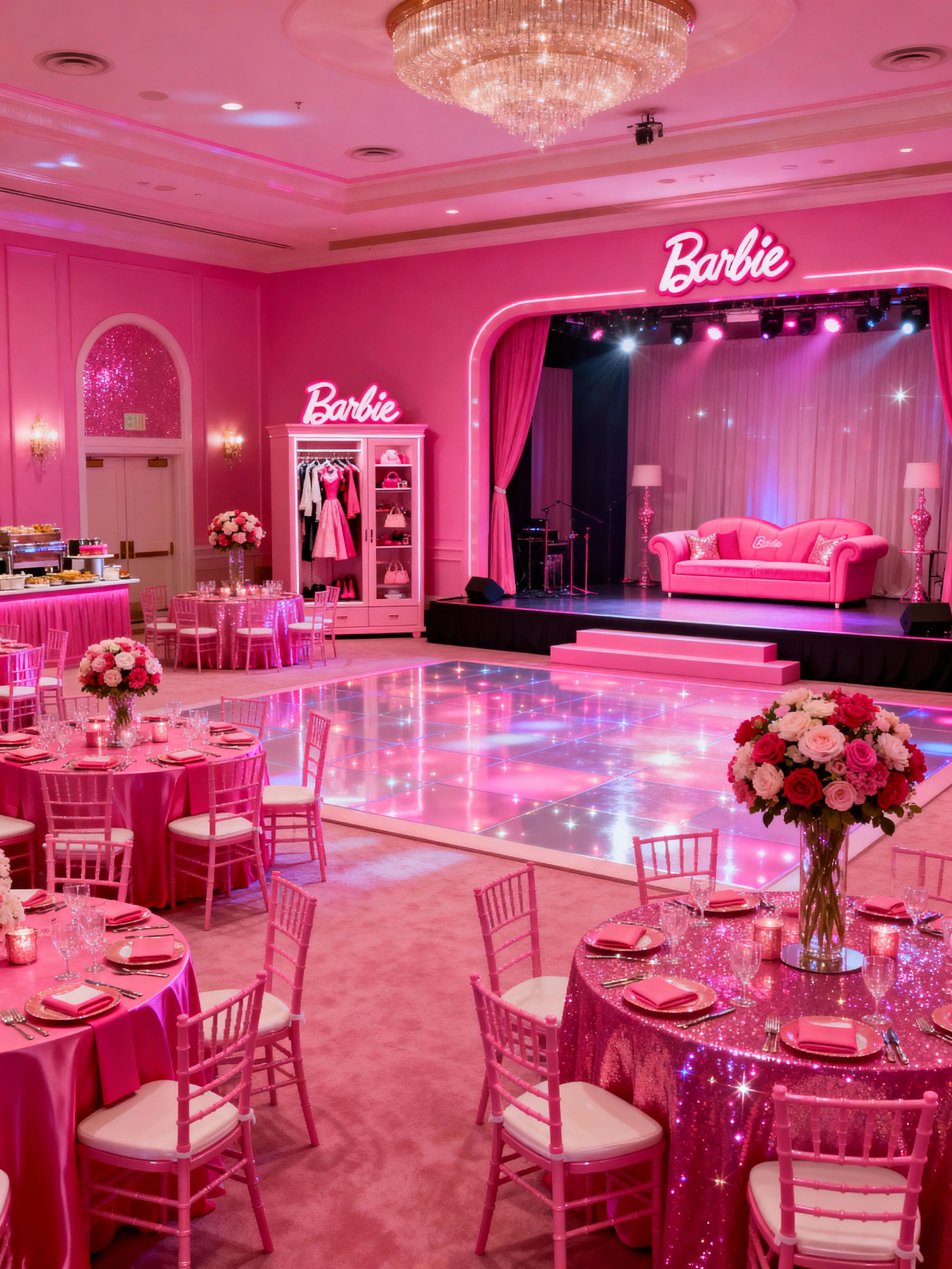 banquet hall with hot pink style with elegant chairs and tablecloths and floral arrangements and dance floor and round tables and centerpieces and buffet tables and stage. . with barbie closet and barbie glitter and sparkle and barbie style interior and barbie plastic interior and hot pink barbie walls and barbie sofa and barbie bold rosy hues like fuchsia and magenta and hot pink barbie colors