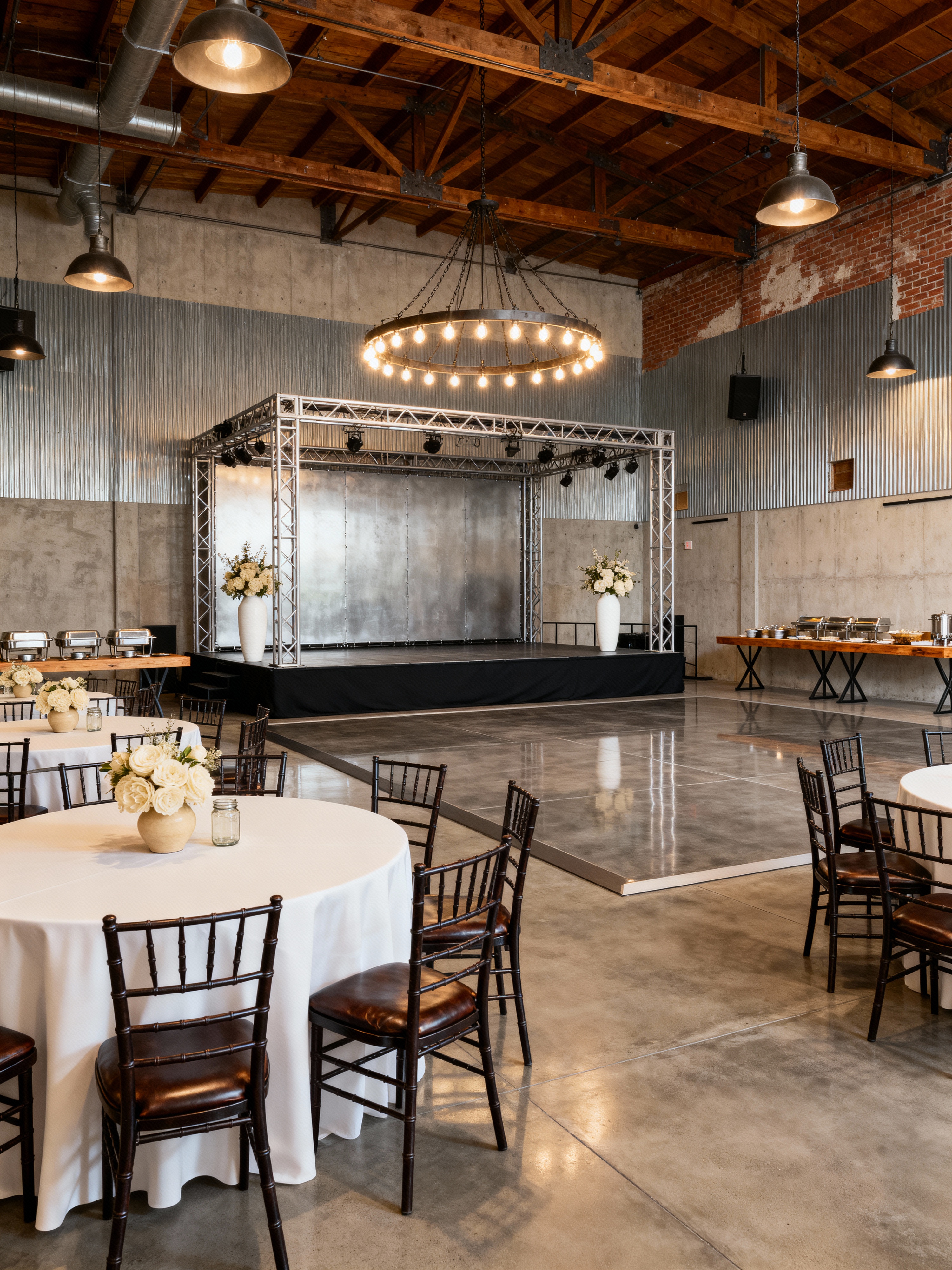 banquet hall with industrial style with stage and dance floor and chandeliers and round tables and buffet tables and tablecloths and elegant chairs and floral arrangements. . with open floorplan and utilitarian objects and exposed concrete and exposed brick and factory style and neutral tones and exposed rafters and metal panels