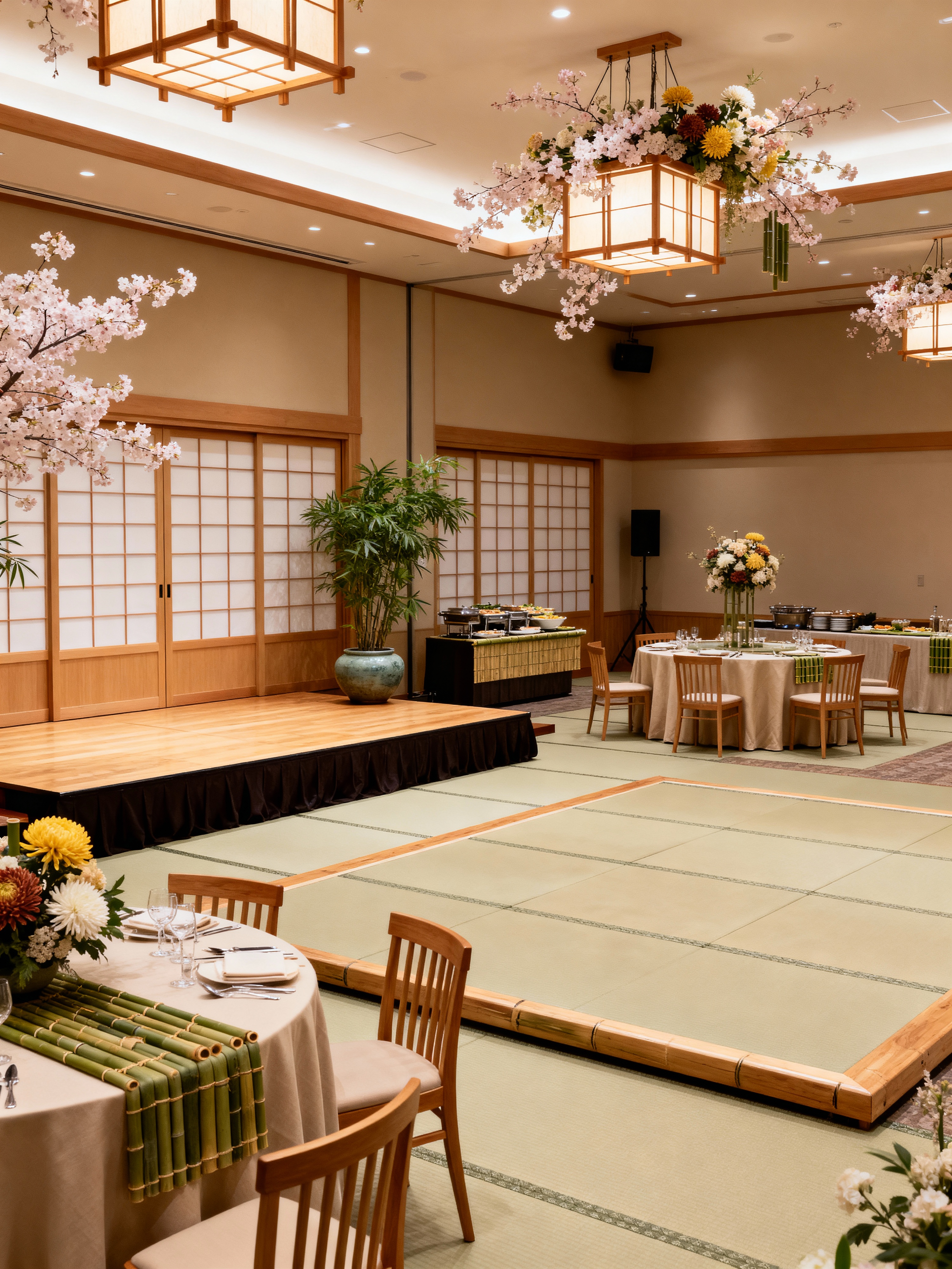banquet hall with japanese design style with elegant decor and floral arrangements and chandeliers and elegant chairs and stage and buffet tables and round tables and dance floor. . with sliding doors and neutral colors and low furniture and zen decor and indoor plants and natural materials and tatami mats and minimalism
