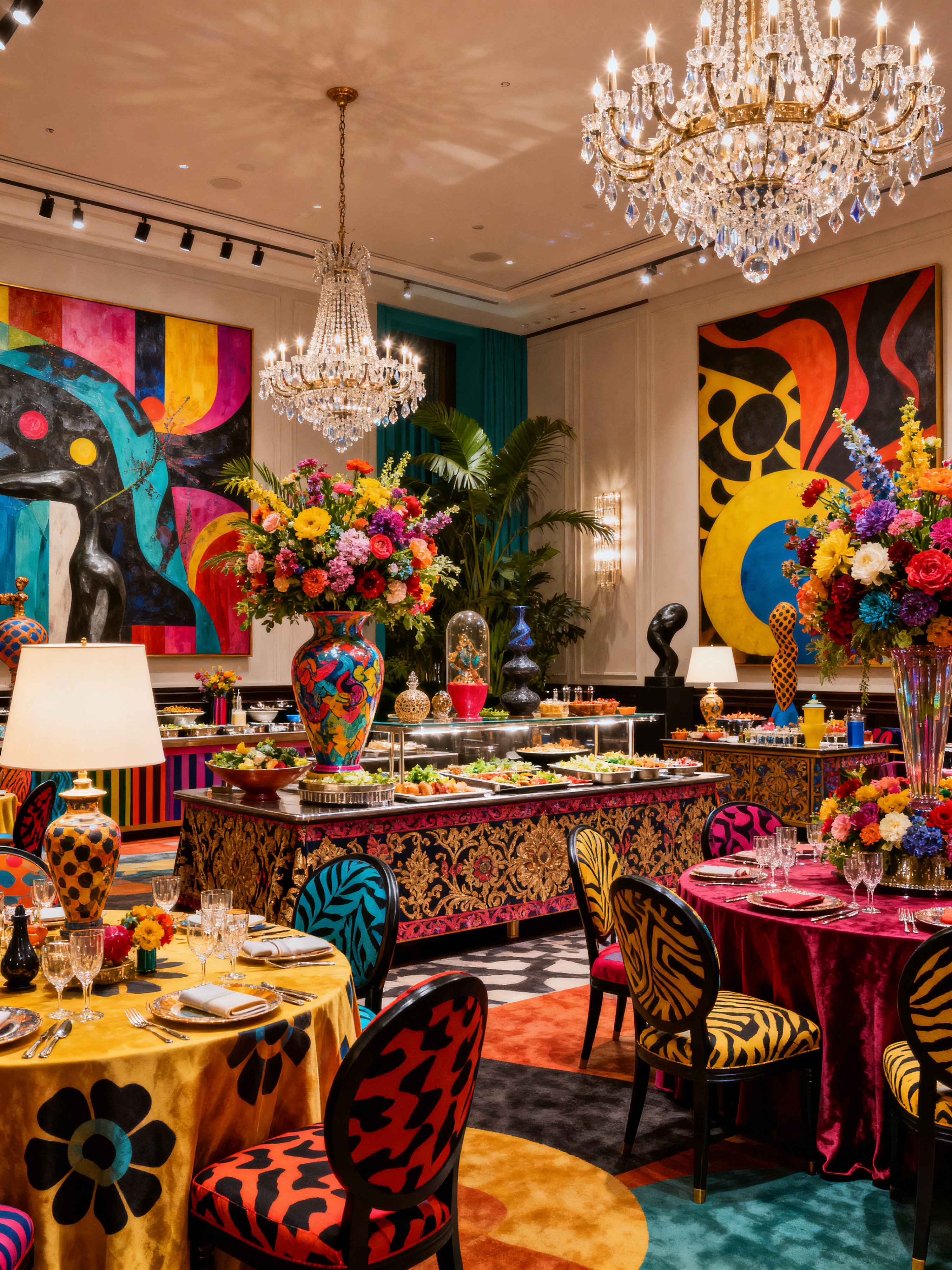 banquet hall with maximalist style with floral arrangements and buffet tables and elegant chairs and chandeliers and round tables and tablecloths and centerpieces and elegant decor. . with eye-catching and bold colors and bold design and playful and over-the-top aesthetic and bold patterns and vibrant and bold creativity