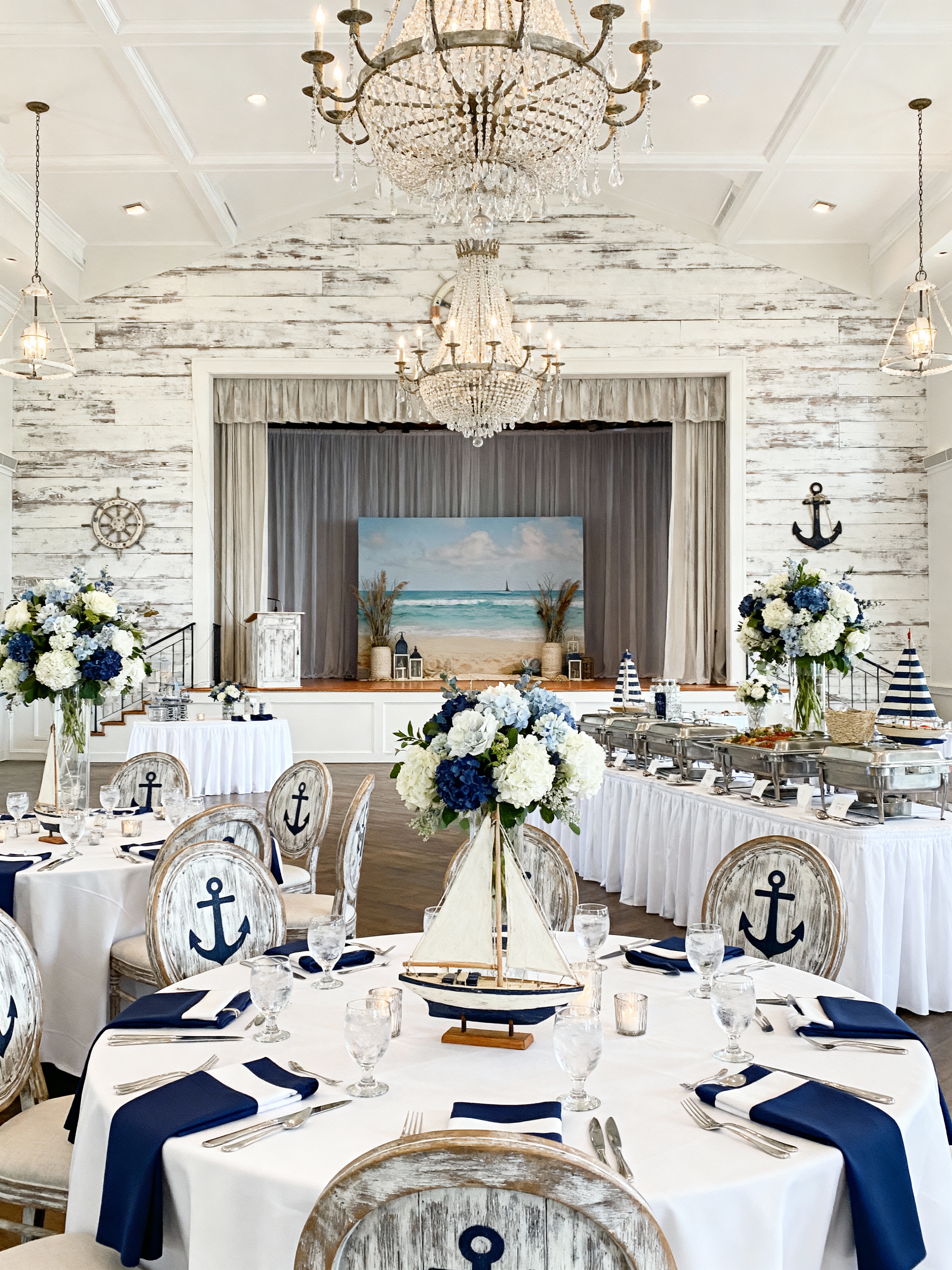 banquet hall with nautical style with centerpieces and elegant chairs and floral arrangements and buffet tables and elegant decor and chandeliers and tablecloths and stage. . with crisp white and seaside charm and navy blue and sailboat elements and anchor motifs and weathered wood and coastal vibes and maritime decor