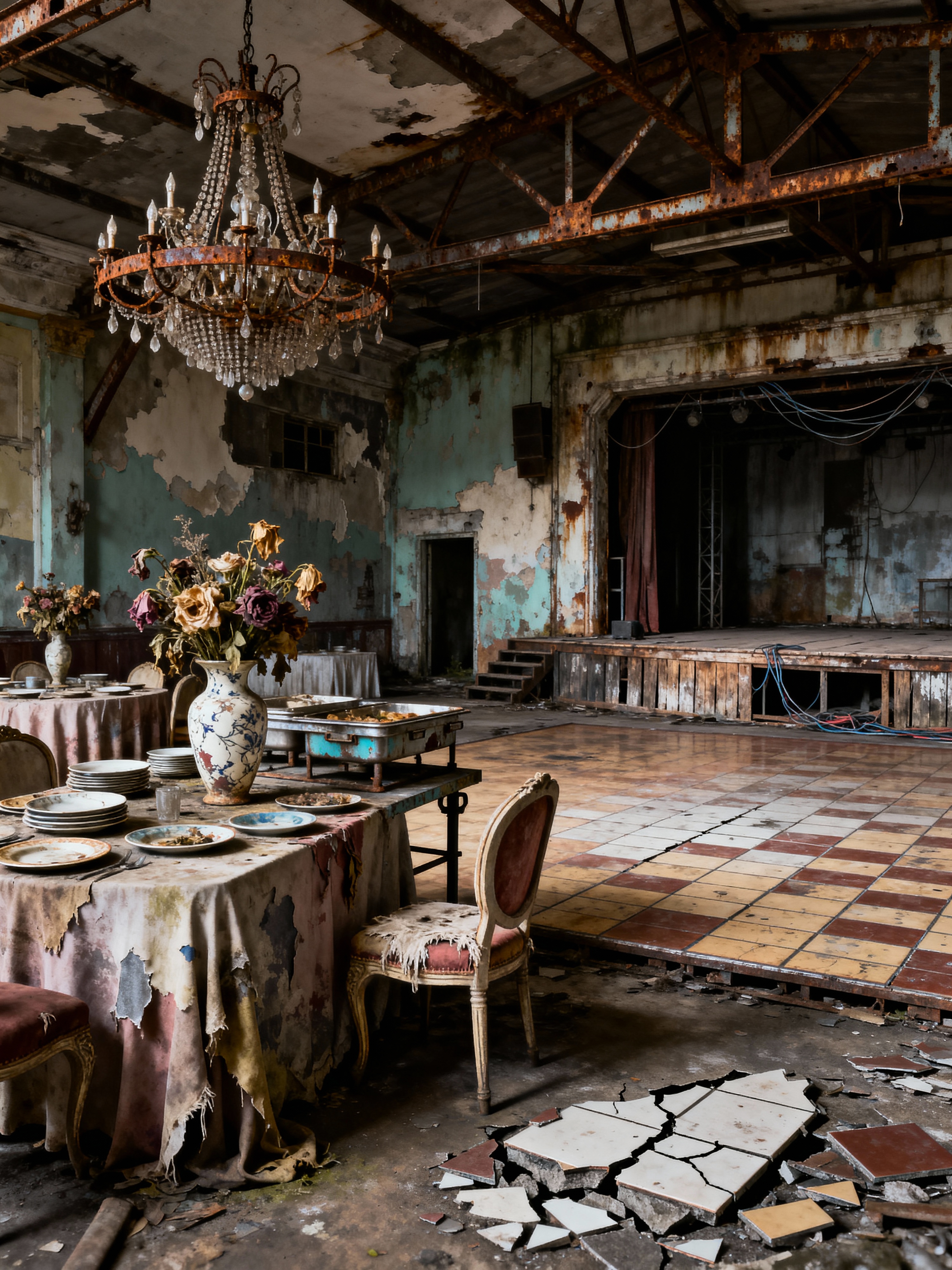 banquet hall with post-apocalyptic style with elegant decor and chandeliers and tablecloths and floral arrangements and buffet tables and dance floor and elegant chairs and stage. . with broken tiles and abandoned look and rusted metal and run-down favela style and weathered materials and industrial elements and neglected atmosphere and desolate