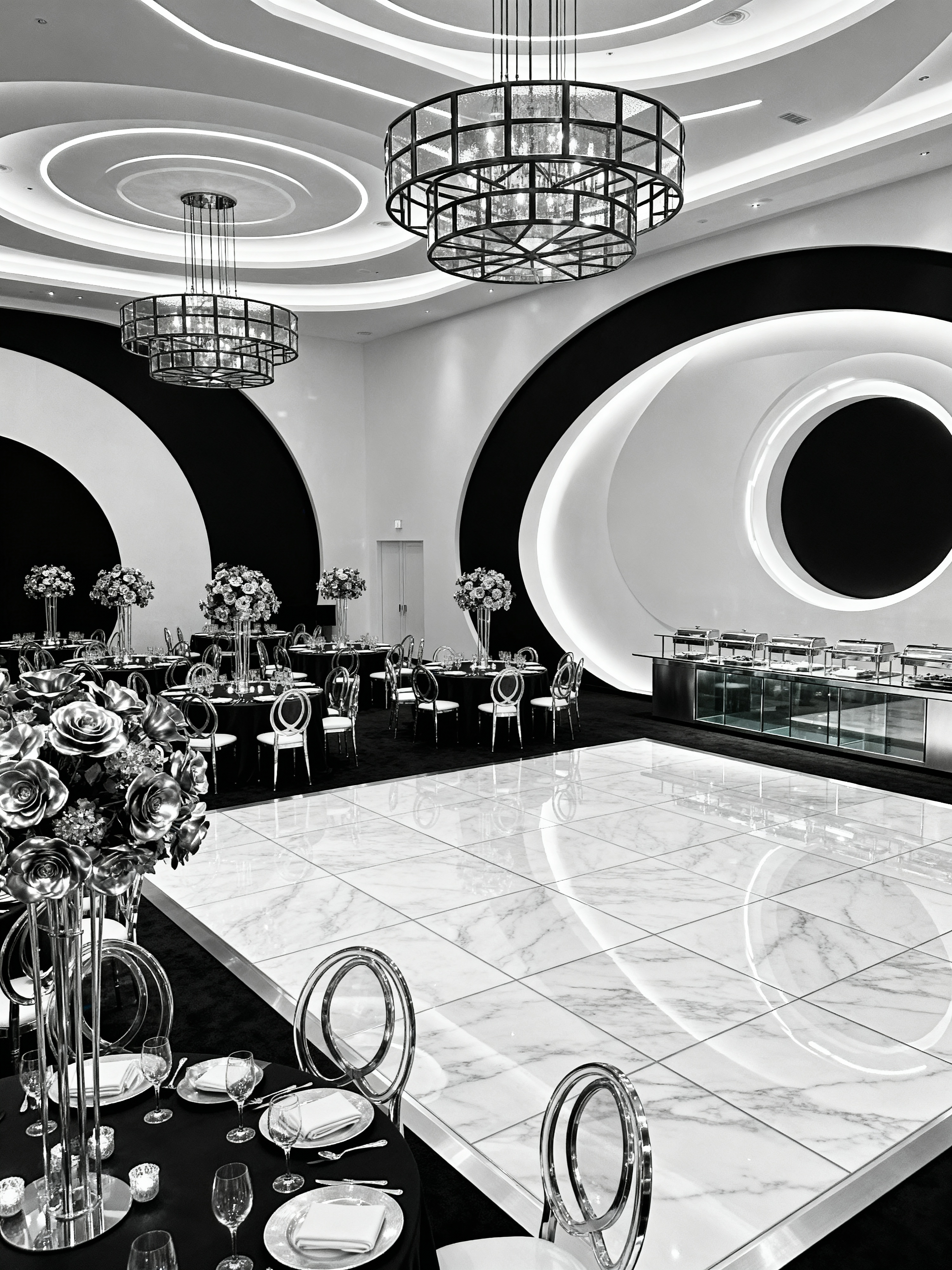 banquet hall with retro futuristic style with elegant decor and tablecloths and floral arrangements and chandeliers and round tables and elegant chairs and dance floor and buffet tables. . with glass panes and steel finishing and minimalist clean lines and smooth marble and monochromatic palette and circular shapes and smooth polished marble and strong geometric walls