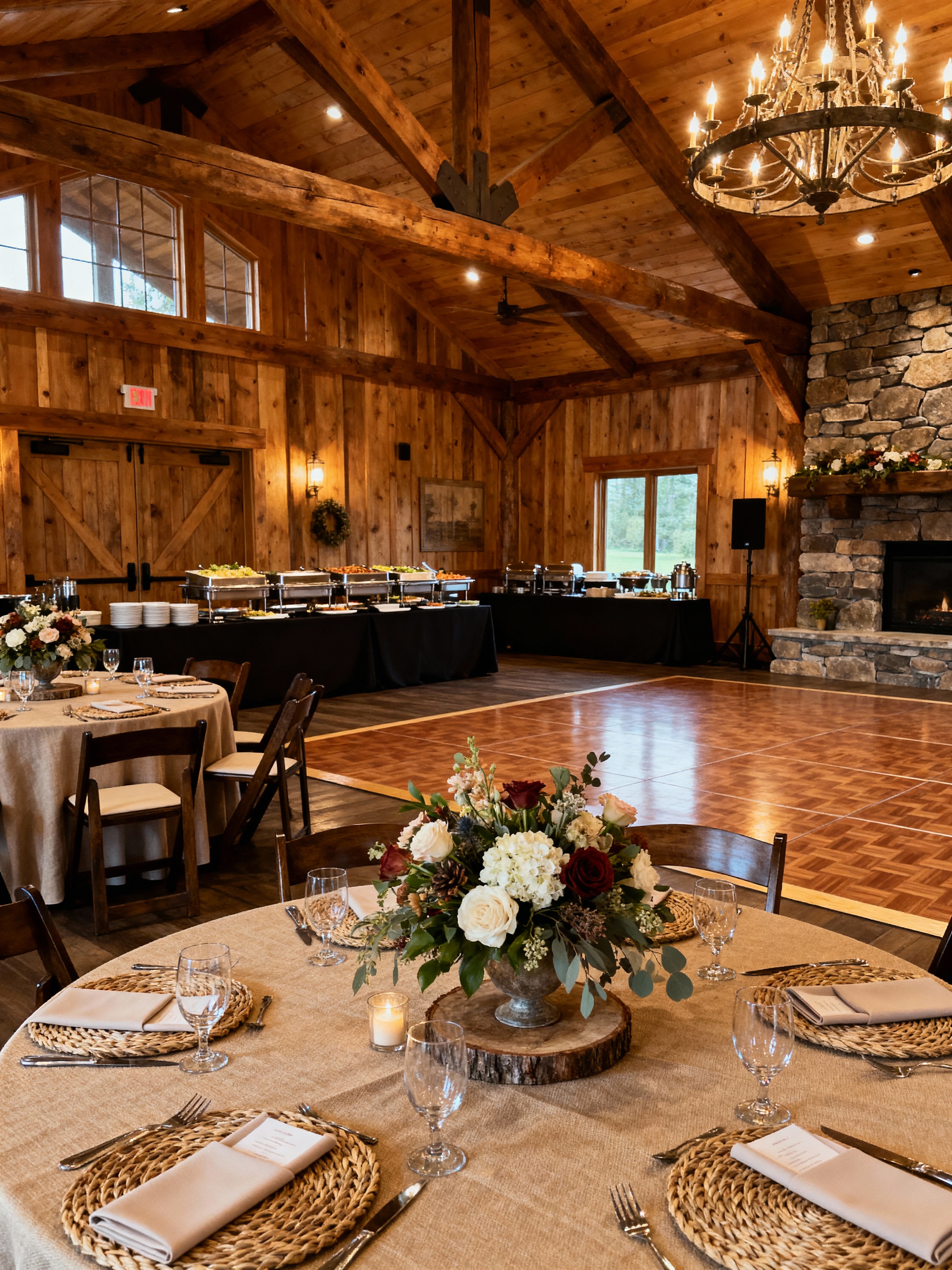 banquet hall with rustic style with floral arrangements and buffet tables and dance floor and tablecloths and elegant decor and round tables and chandeliers and centerpieces. . with natural wood and warmth and cozy cabin and country style and stone accents and woven textures and exposed beams and earthy tones