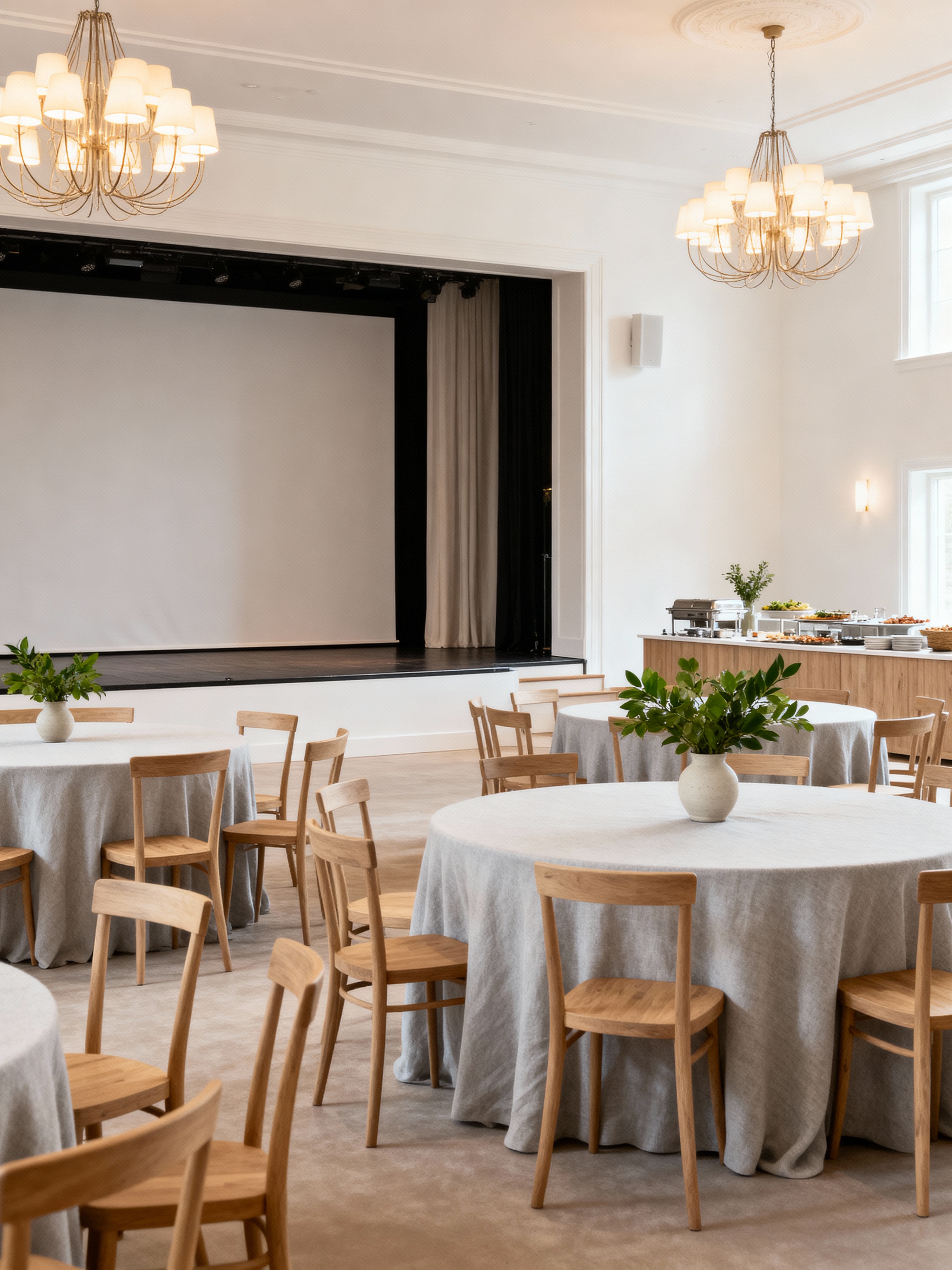 banquet hall with scandinavian style with stage and tablecloths and elegant chairs and centerpieces and elegant decor and round tables and buffet tables and chandeliers. . with functional furniture and hygge and minimalist design and simple elegance and cozy atmosphere and natural light and textured fabrics and neutral palette