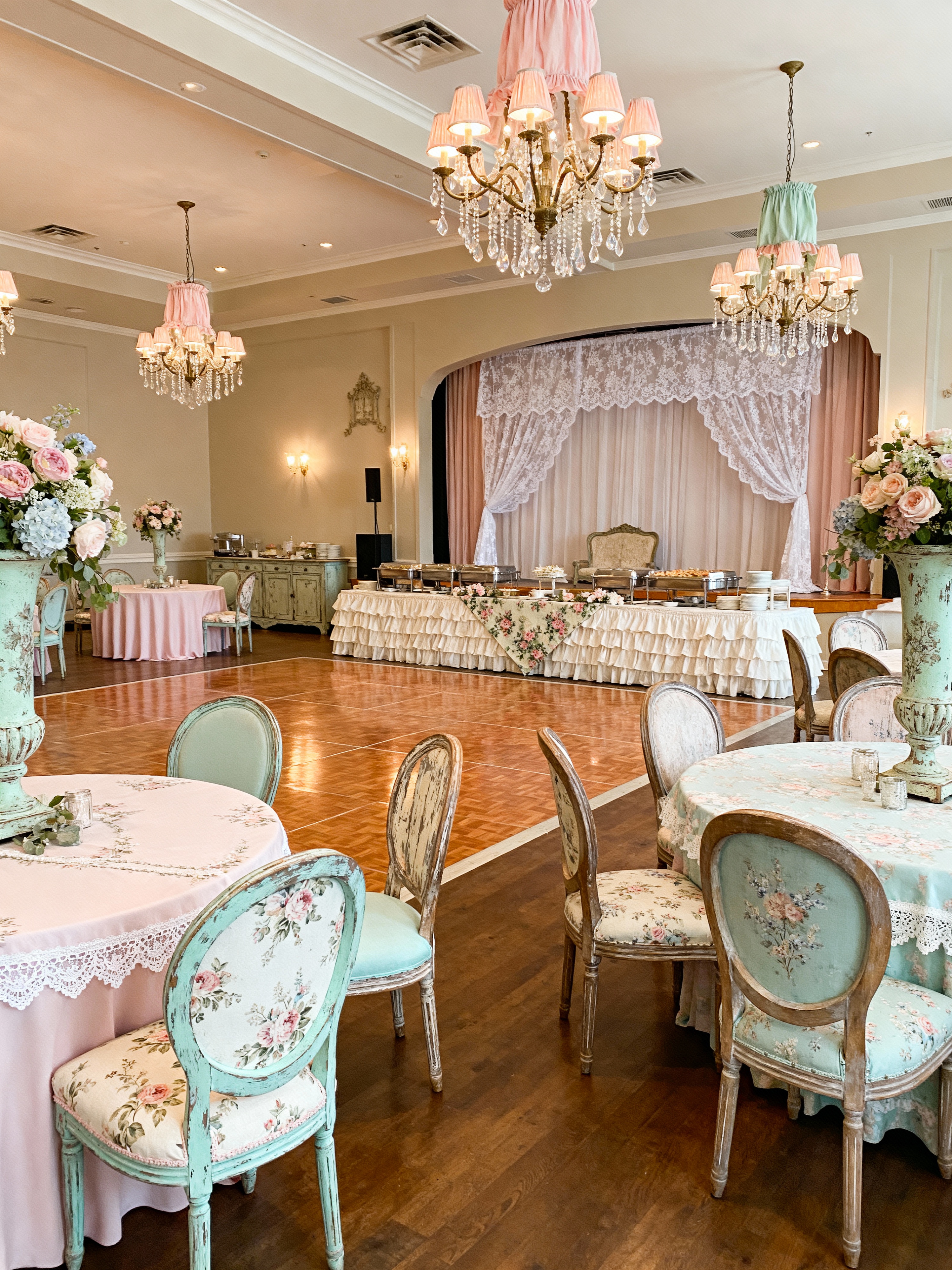 banquet hall with shabby chic style with chandeliers and stage and buffet tables and tablecloths and round tables and floral arrangements and dance floor and elegant chairs. . with weathered finishes and cottage feel and soft textures and feminine touches and pastel colors and distressed furniture and floral patterns and delicate details