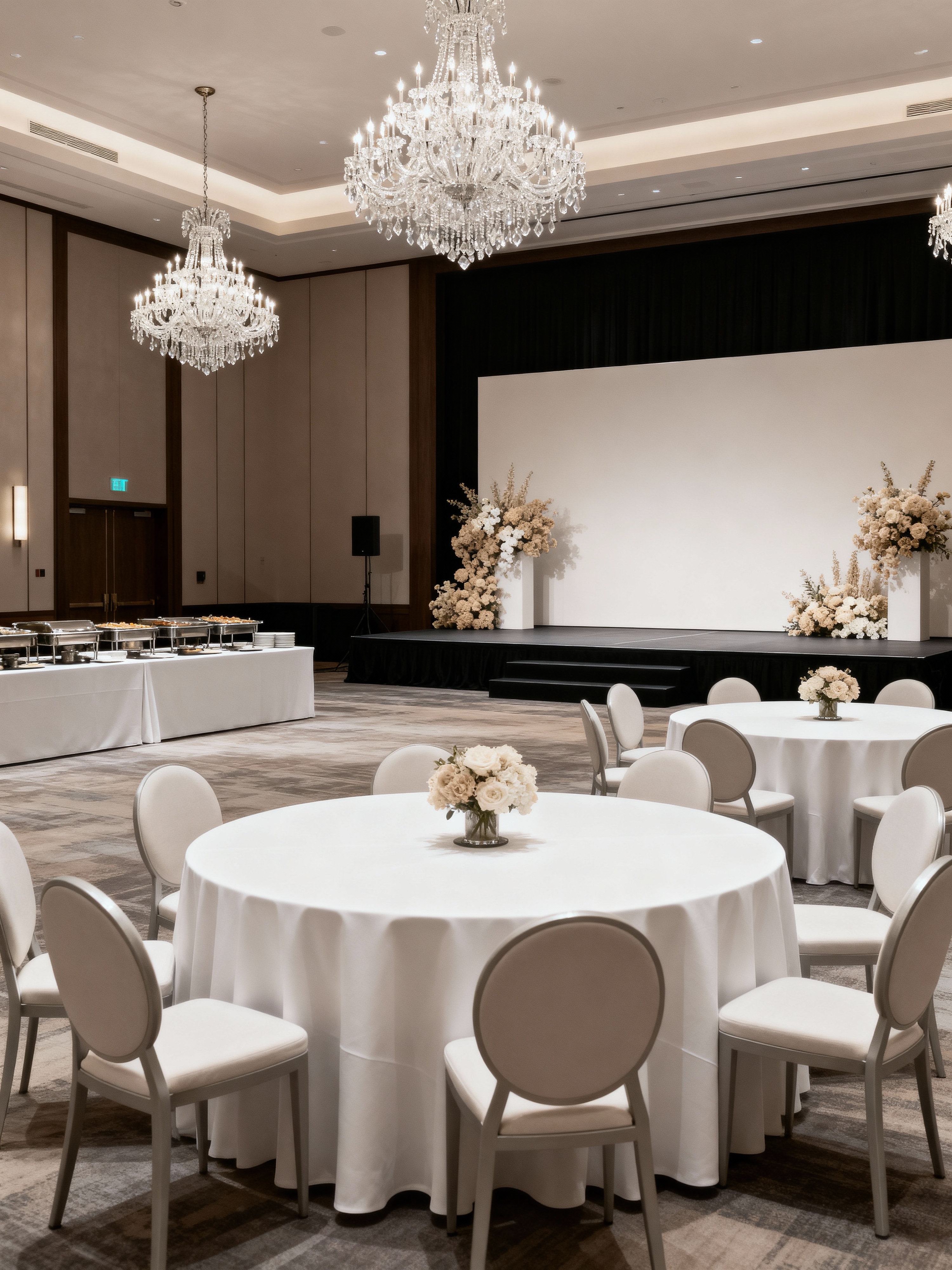 banquet hall with simple style with elegant decor and round tables and centerpieces and chandeliers and tablecloths and buffet tables and floral arrangements and stage. . with calm atmosphere and streamlined look and essential pieces and clean design and functional furniture and neutral colors and basic elements and minimal decor
