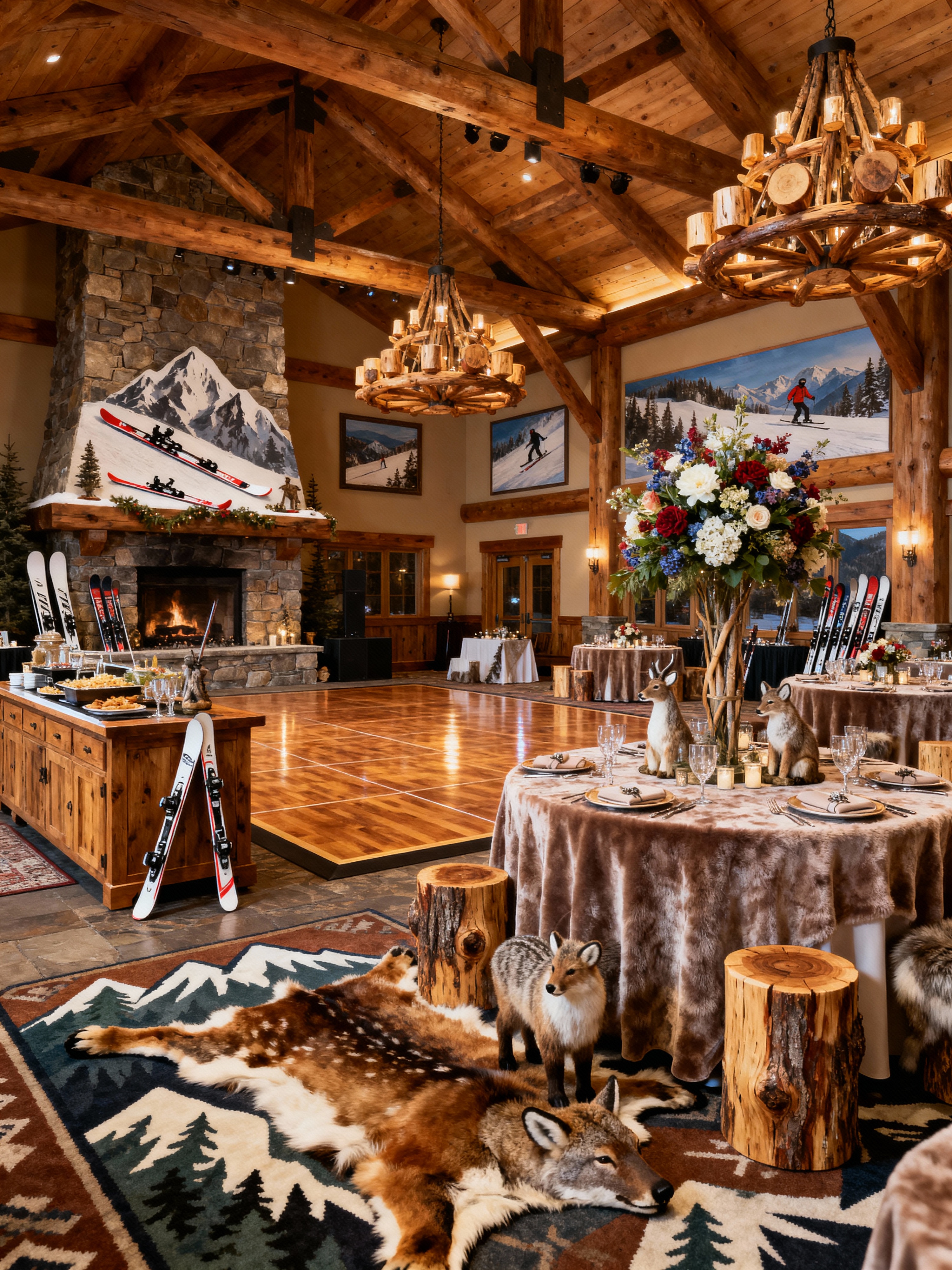 banquet hall with ski chalet style with centerpieces and elegant decor and dance floor and buffet tables and chandeliers and floral arrangements and round tables and tablecloths. . with animal motifs and wooden logs and wood beams and stone fireplace and exposed construction beams and animal rugs and mountain-inspired and ski-themed decor