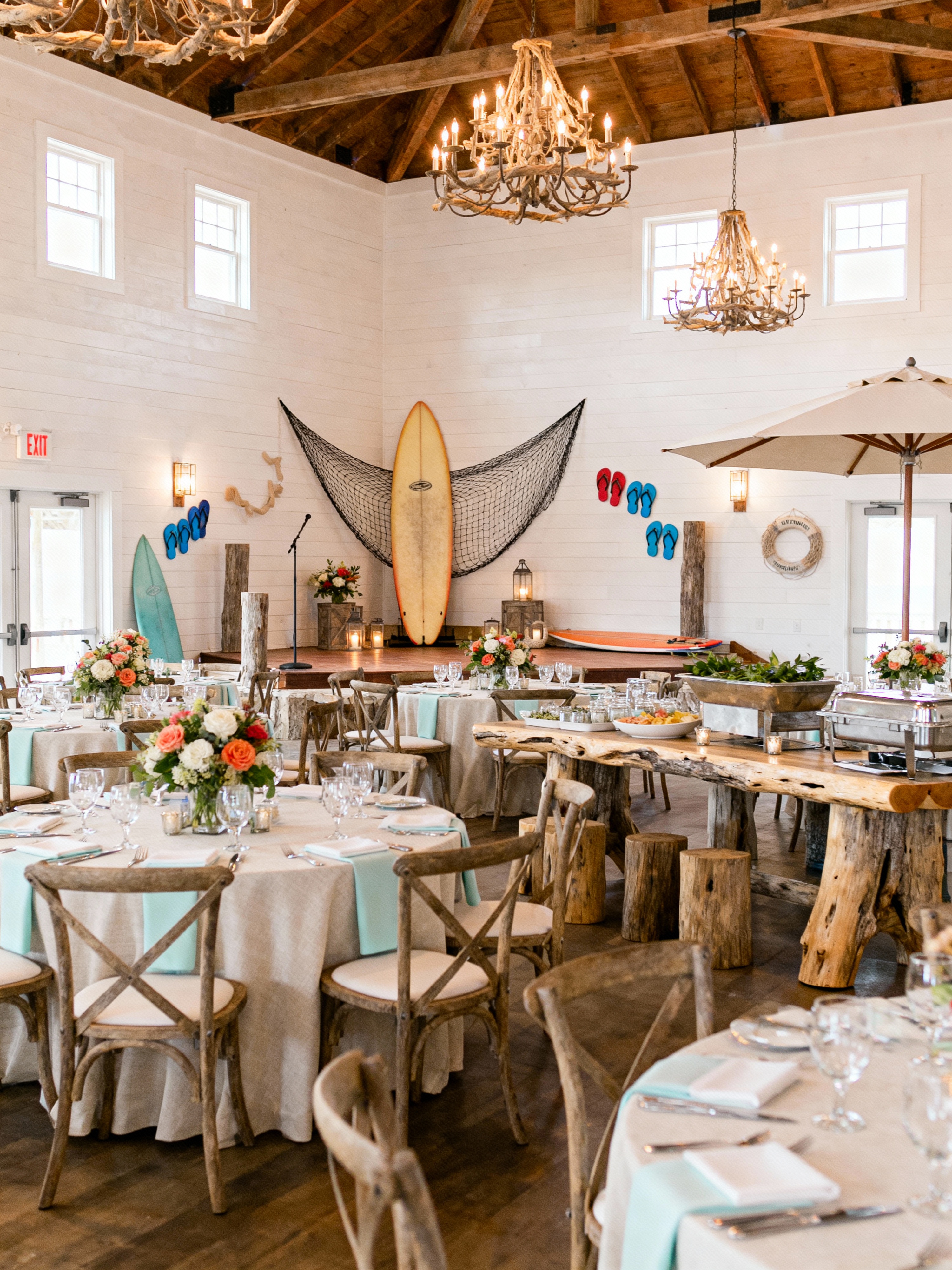 banquet hall with surf shack style with centerpieces and floral arrangements and buffet tables and elegant decor and stage and elegant chairs and tablecloths and chandeliers. . with relaxed atmosphere and driftwood furniture and casual dining and net decorations and flip-flops and beach umbrellas and surfboard decor and white-washed walls