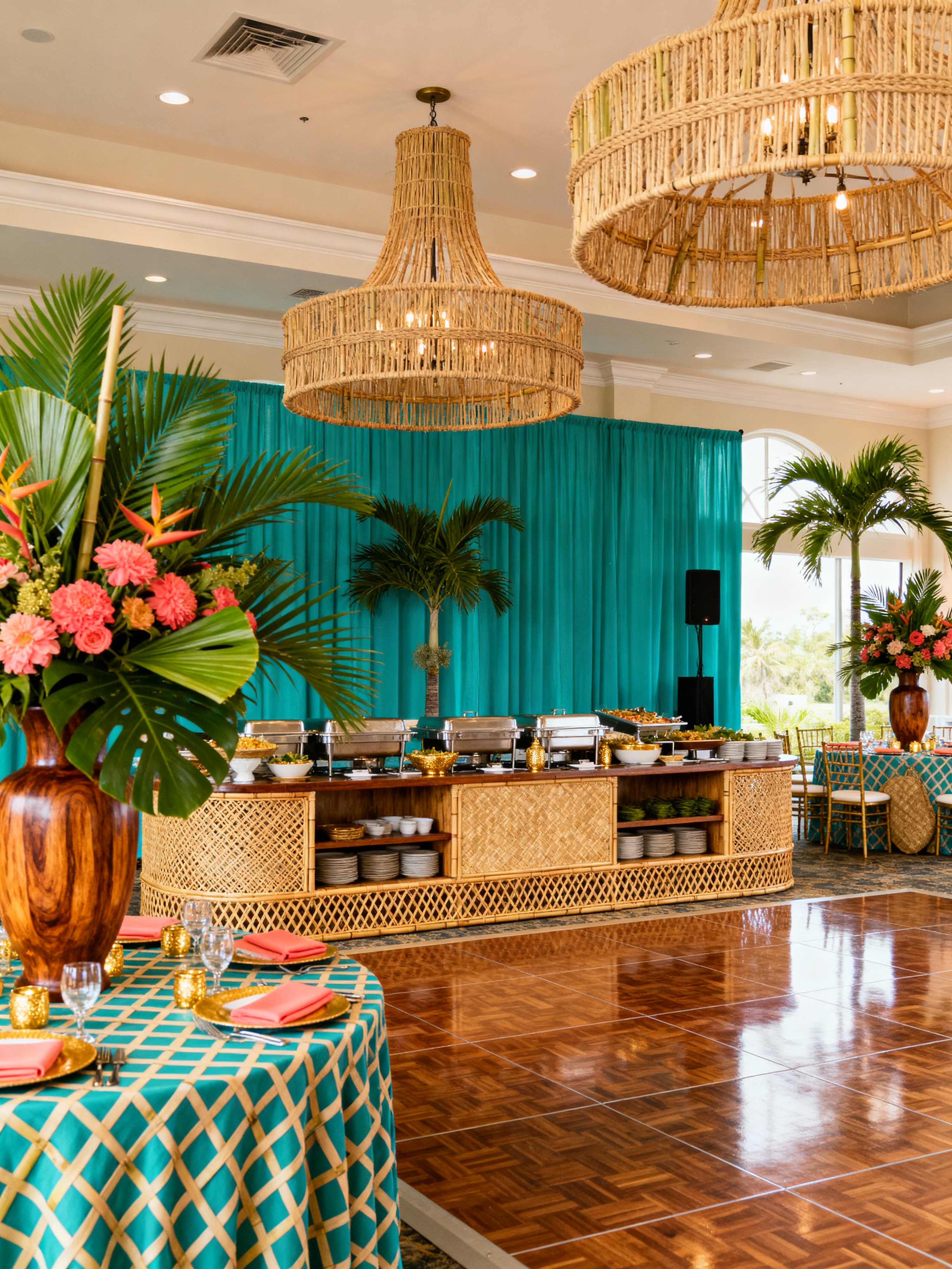 banquet hall with tropical style with round tables and buffet tables and centerpieces and tablecloths and chandeliers and dance floor and floral arrangements and elegant decor. . with lattice prints and palm trees and bamboo and rattan and teak and wicker and palm leaves and cane motifs