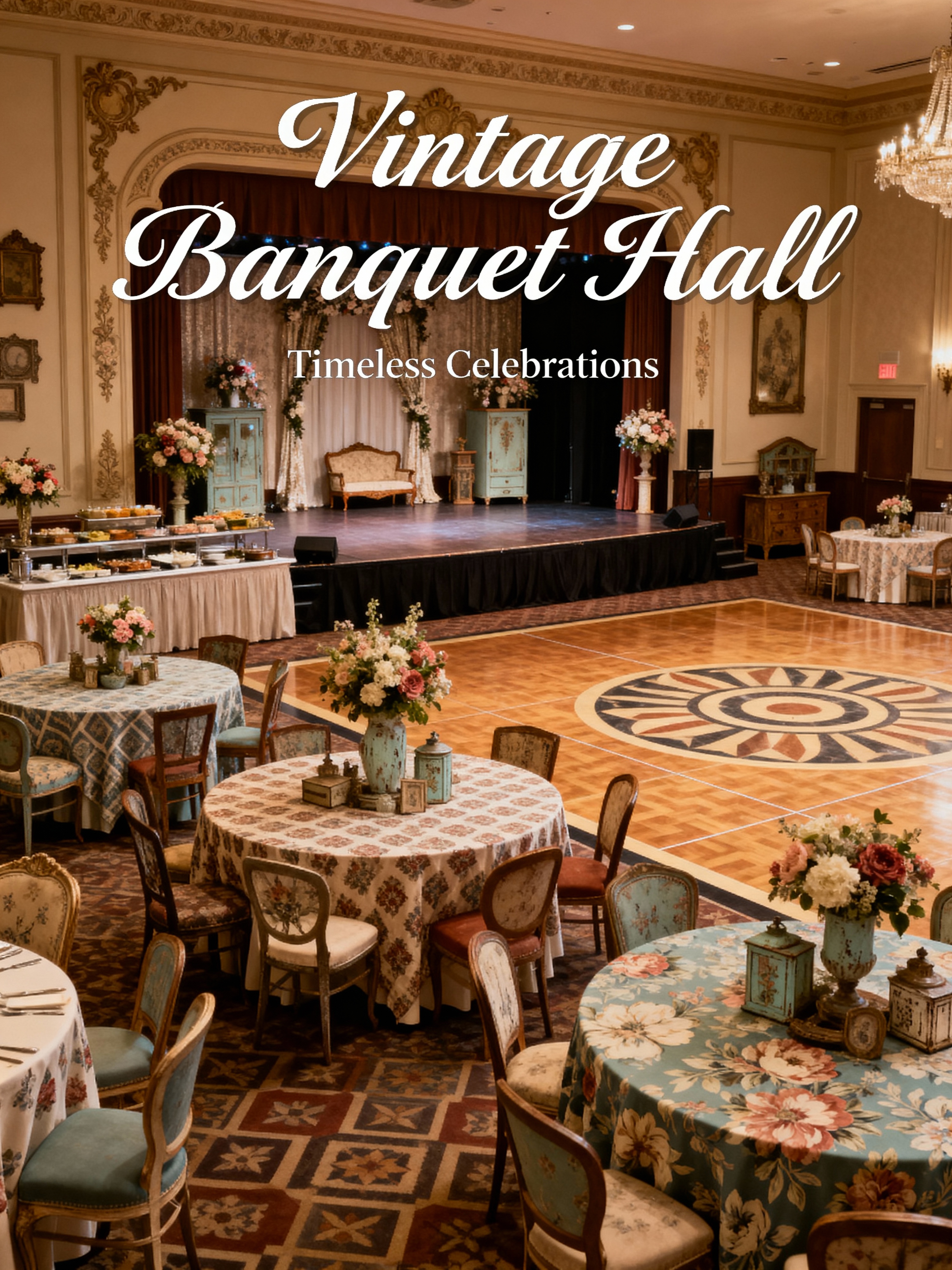 banquet hall with vintage style with tablecloths and floral arrangements and buffet tables and round tables and elegant decor and stage and dance floor and centerpieces. . with ornate details and bold patterns and eclectic and nostalgic feel and mid-century and shabby chic and upcycled furniture and timeless pieces