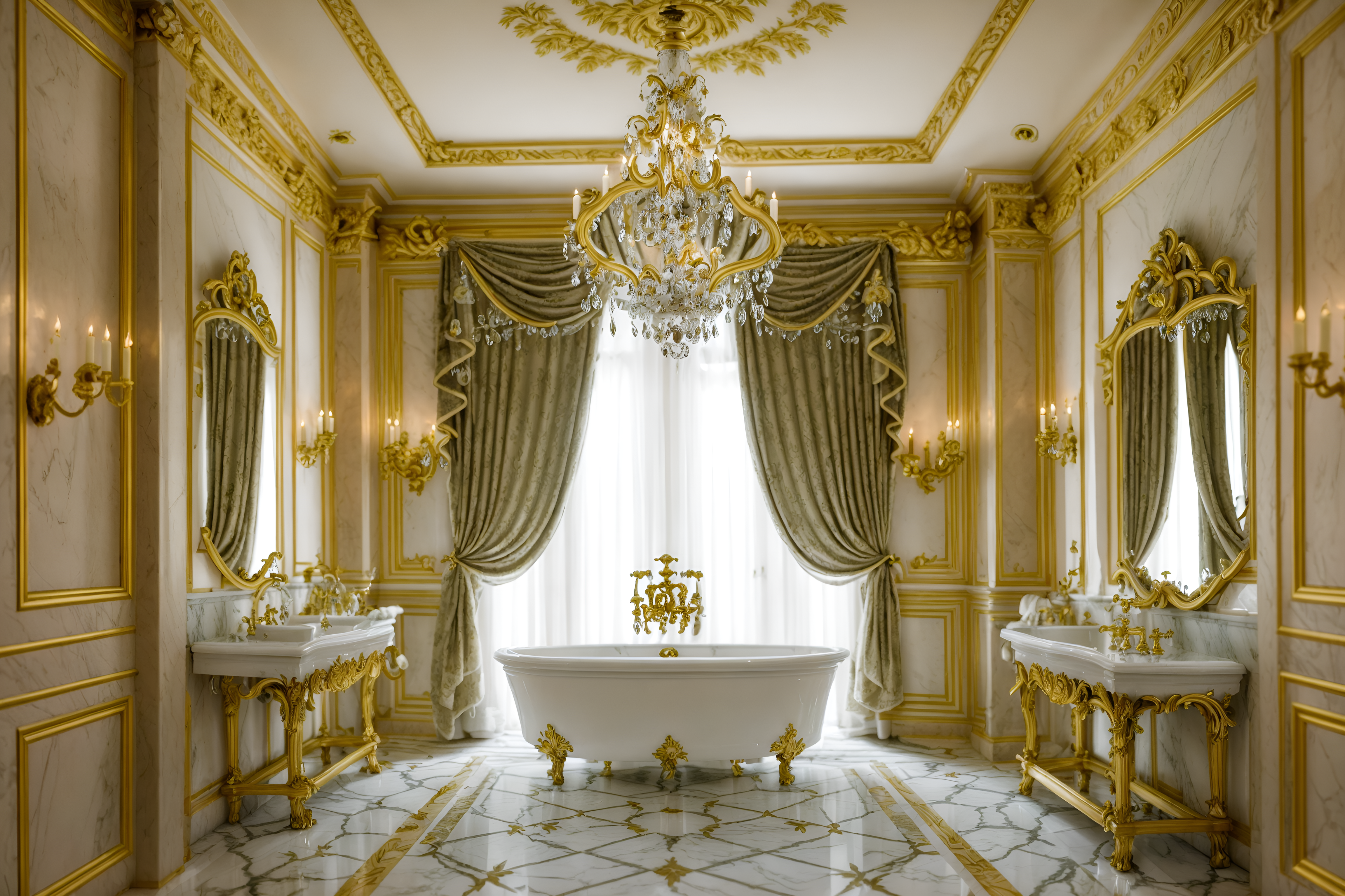 photo from pinterest of baroque-style interior designed (bathroom interior) with bath towel and mirror and bathtub and bathroom cabinet and bathroom sink with faucet and bath rail and shower and plant. . with luxurious floral and damask fabrics and heavy moldings and emotional exuberance and tension and crystal and glass accents and grandeur and pedestal feet and sensuous richness. . cinematic photo, highly detailed, cinematic lighting, ultra-detailed, ultrarealistic, photorealism, 8k. trending on pinterest. baroque interior design style. masterpiece, cinematic light, ultrarealistic+, photorealistic+, 8k, raw photo, realistic, sharp focus on eyes, (symmetrical eyes), (intact eyes), hyperrealistic, highest quality, best quality, , highly detailed, masterpiece, best quality, extremely detailed 8k wallpaper, masterpiece, best quality, ultra-detailed, best shadow, detailed background, detailed face, detailed eyes, high contrast, best illumination, detailed face, dulux, caustic, dynamic angle, detailed glow. dramatic lighting. highly detailed, insanely detailed hair, symmetrical, intricate details, professionally retouched, 8k high definition. strong bokeh. award winning photo.