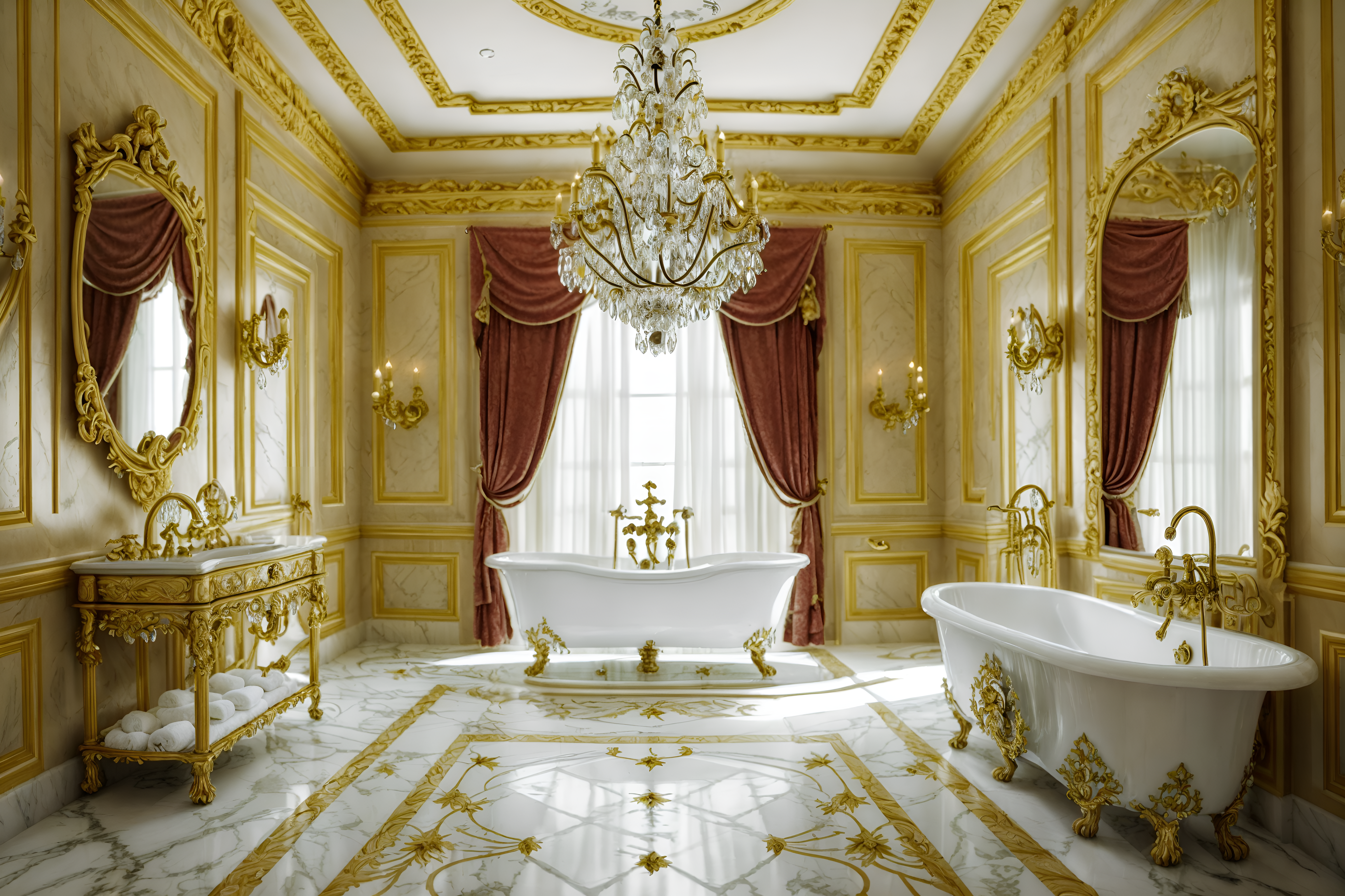 photo from pinterest of baroque-style interior designed (bathroom interior) with bath towel and mirror and bathtub and bathroom cabinet and bathroom sink with faucet and bath rail and shower and plant. . with luxurious floral and damask fabrics and heavy moldings and emotional exuberance and tension and crystal and glass accents and grandeur and pedestal feet and sensuous richness. . cinematic photo, highly detailed, cinematic lighting, ultra-detailed, ultrarealistic, photorealism, 8k. trending on pinterest. baroque interior design style. masterpiece, cinematic light, ultrarealistic+, photorealistic+, 8k, raw photo, realistic, sharp focus on eyes, (symmetrical eyes), (intact eyes), hyperrealistic, highest quality, best quality, , highly detailed, masterpiece, best quality, extremely detailed 8k wallpaper, masterpiece, best quality, ultra-detailed, best shadow, detailed background, detailed face, detailed eyes, high contrast, best illumination, detailed face, dulux, caustic, dynamic angle, detailed glow. dramatic lighting. highly detailed, insanely detailed hair, symmetrical, intricate details, professionally retouched, 8k high definition. strong bokeh. award winning photo.