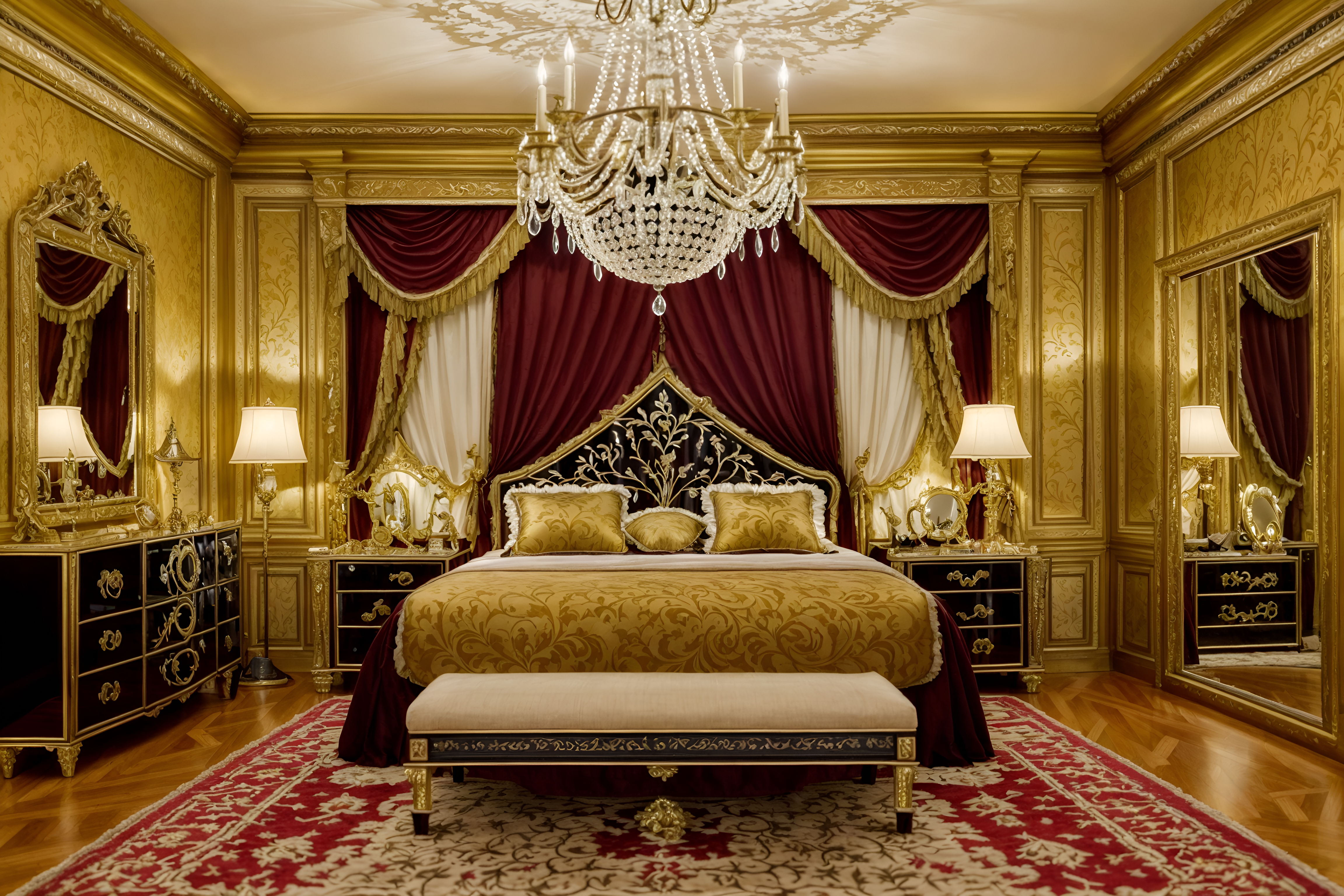 photo from pinterest of baroque-style interior designed (bedroom interior) with storage bench or ottoman and accent chair and headboard and mirror and plant and night light and dresser closet and bedside table or night stand. . with emotional exuberance and dynamism and elaborate ornamentation and crystal and glass accents and drama and tension and movement and opulent and colossal furniture. . cinematic photo, highly detailed, cinematic lighting, ultra-detailed, ultrarealistic, photorealism, 8k. trending on pinterest. baroque interior design style. masterpiece, cinematic light, ultrarealistic+, photorealistic+, 8k, raw photo, realistic, sharp focus on eyes, (symmetrical eyes), (intact eyes), hyperrealistic, highest quality, best quality, , highly detailed, masterpiece, best quality, extremely detailed 8k wallpaper, masterpiece, best quality, ultra-detailed, best shadow, detailed background, detailed face, detailed eyes, high contrast, best illumination, detailed face, dulux, caustic, dynamic angle, detailed glow. dramatic lighting. highly detailed, insanely detailed hair, symmetrical, intricate details, professionally retouched, 8k high definition. strong bokeh. award winning photo.