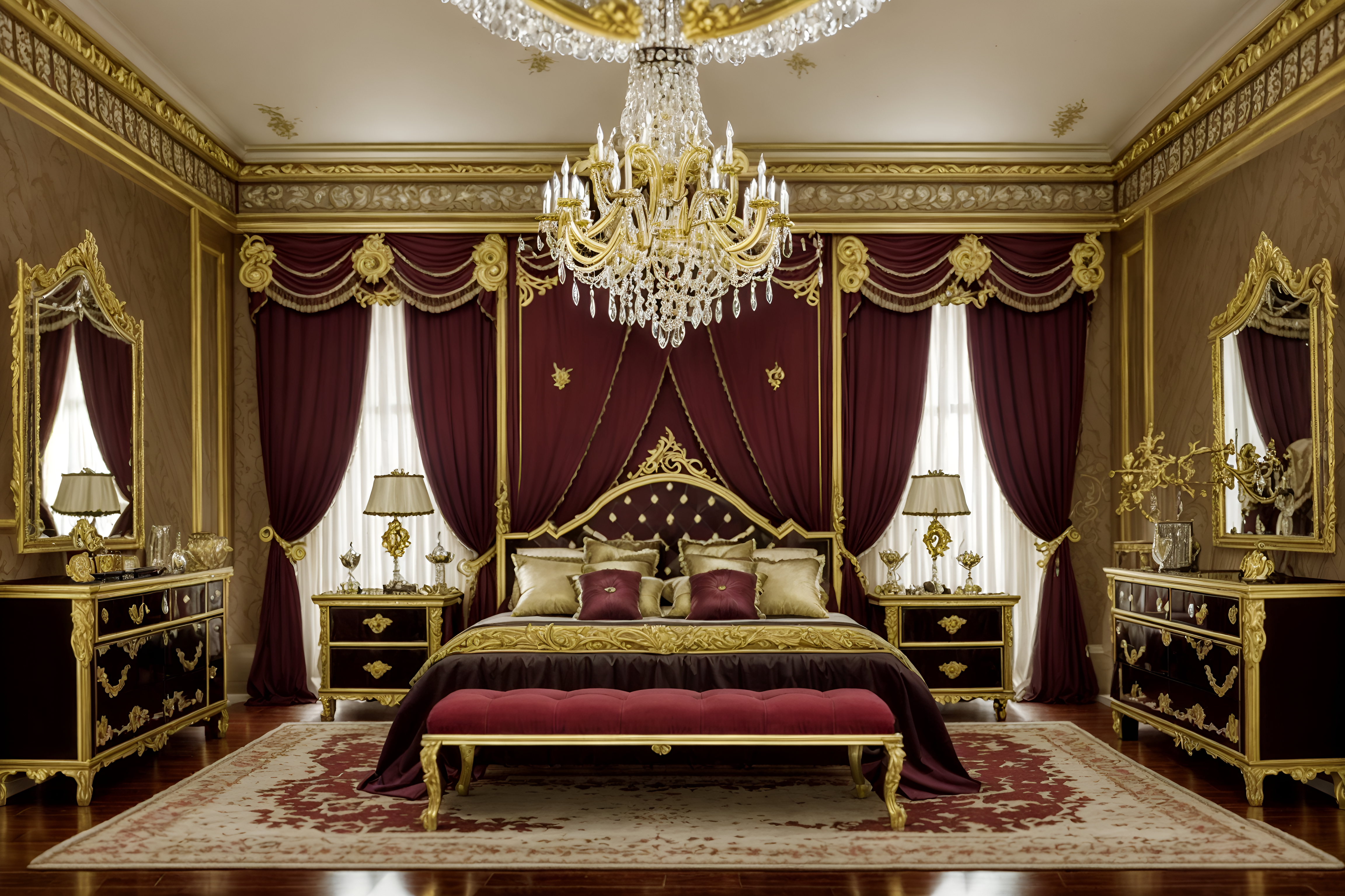 photo from pinterest of baroque-style interior designed (bedroom interior) with storage bench or ottoman and accent chair and headboard and mirror and plant and night light and dresser closet and bedside table or night stand. . with emotional exuberance and dynamism and elaborate ornamentation and crystal and glass accents and drama and tension and movement and opulent and colossal furniture. . cinematic photo, highly detailed, cinematic lighting, ultra-detailed, ultrarealistic, photorealism, 8k. trending on pinterest. baroque interior design style. masterpiece, cinematic light, ultrarealistic+, photorealistic+, 8k, raw photo, realistic, sharp focus on eyes, (symmetrical eyes), (intact eyes), hyperrealistic, highest quality, best quality, , highly detailed, masterpiece, best quality, extremely detailed 8k wallpaper, masterpiece, best quality, ultra-detailed, best shadow, detailed background, detailed face, detailed eyes, high contrast, best illumination, detailed face, dulux, caustic, dynamic angle, detailed glow. dramatic lighting. highly detailed, insanely detailed hair, symmetrical, intricate details, professionally retouched, 8k high definition. strong bokeh. award winning photo.
