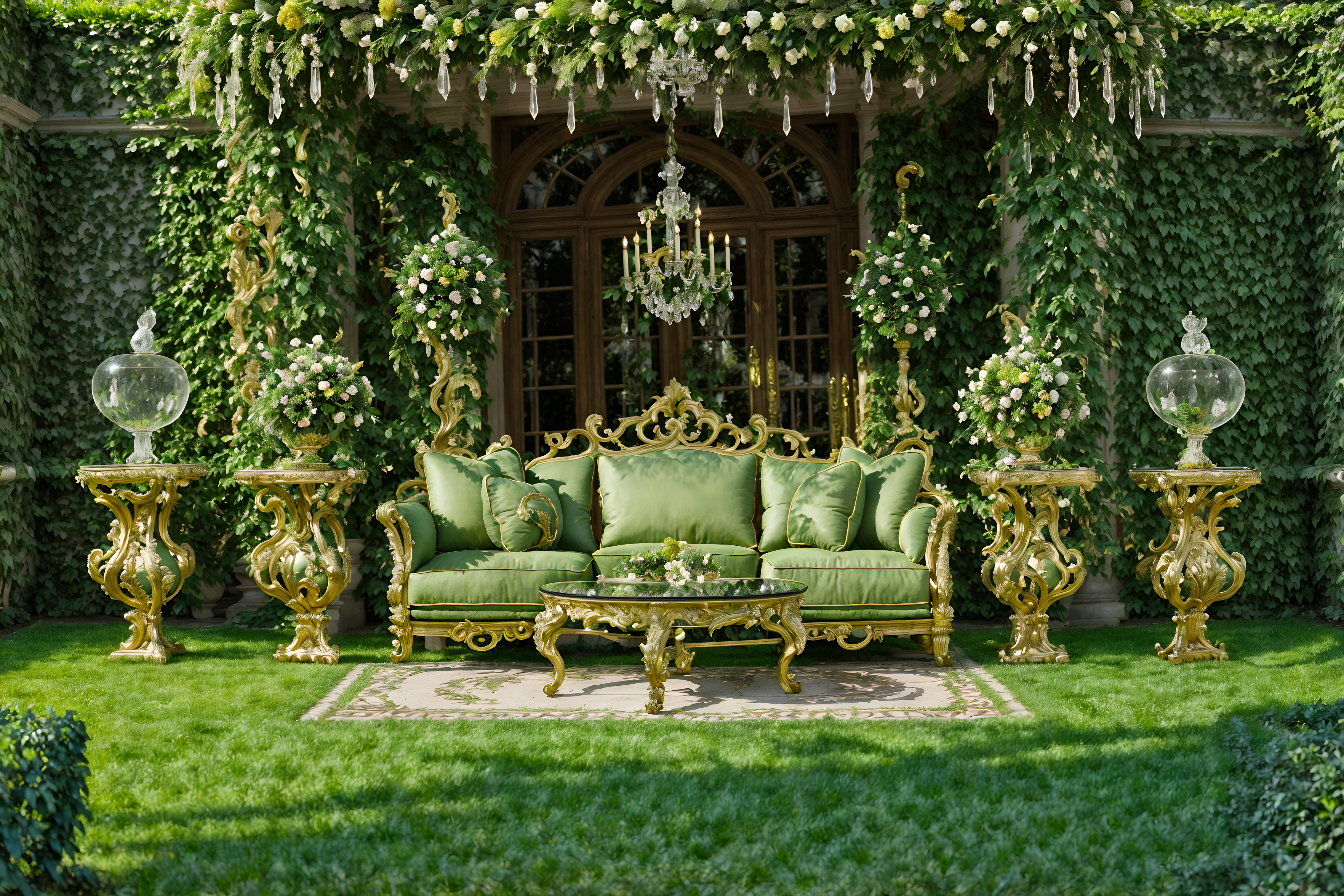 baroque outdoor gardensinterior decorate this outdoor garden with baroque style. . . with grass and garden plants and garden tree and grass. . with movement and pedestal feet and expensive and plush flooring and twisted columns and opulent and colossal furniture and crystal and glass accents and dynamism and luxurious floral and damask fabrics. . .