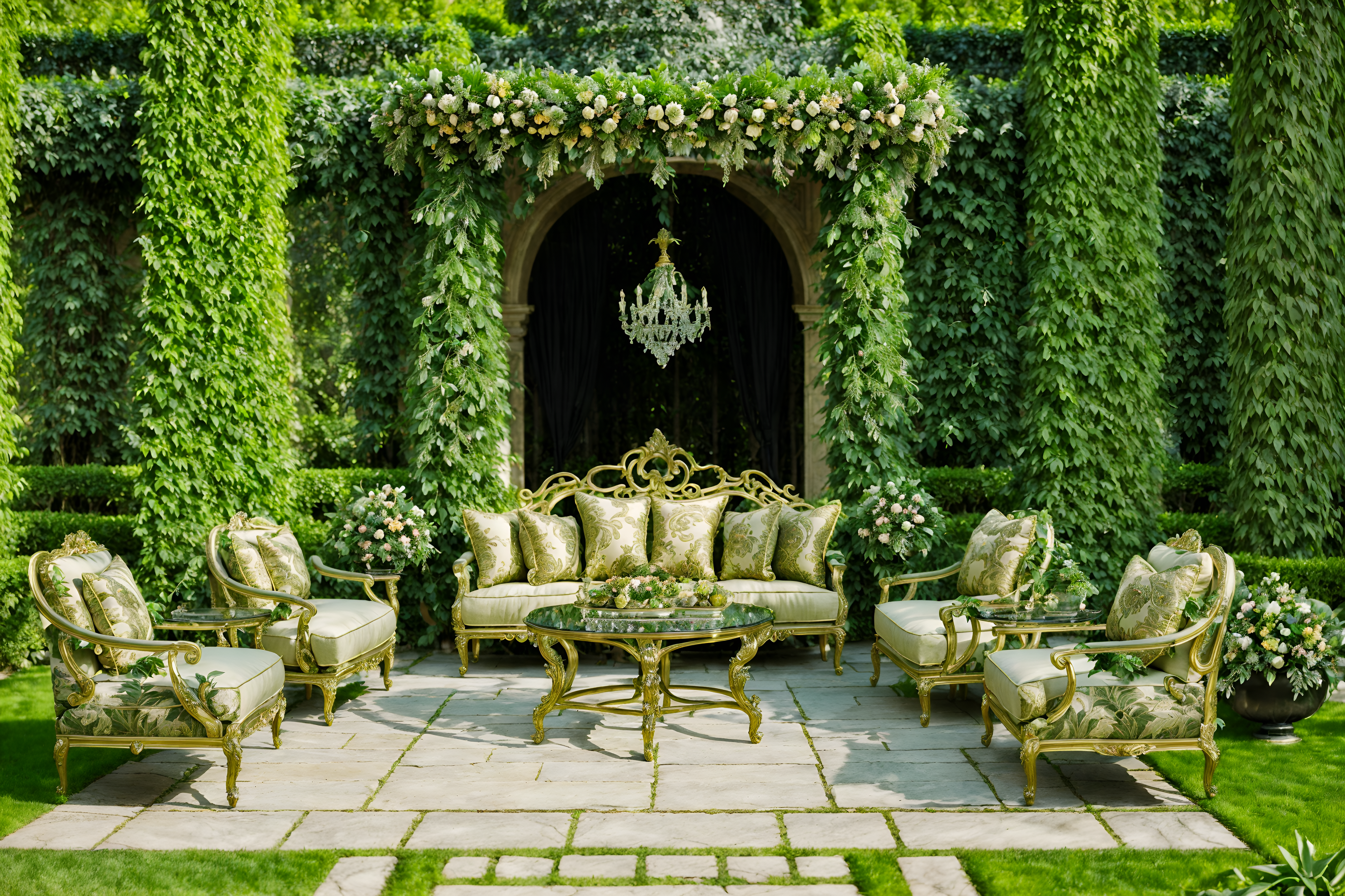 baroque outdoor gardensinterior decorate this outdoor garden with baroque style. . . with grass and garden plants and garden tree and grass. . with movement and pedestal feet and expensive and plush flooring and twisted columns and opulent and colossal furniture and crystal and glass accents and dynamism and luxurious floral and damask fabrics. . .