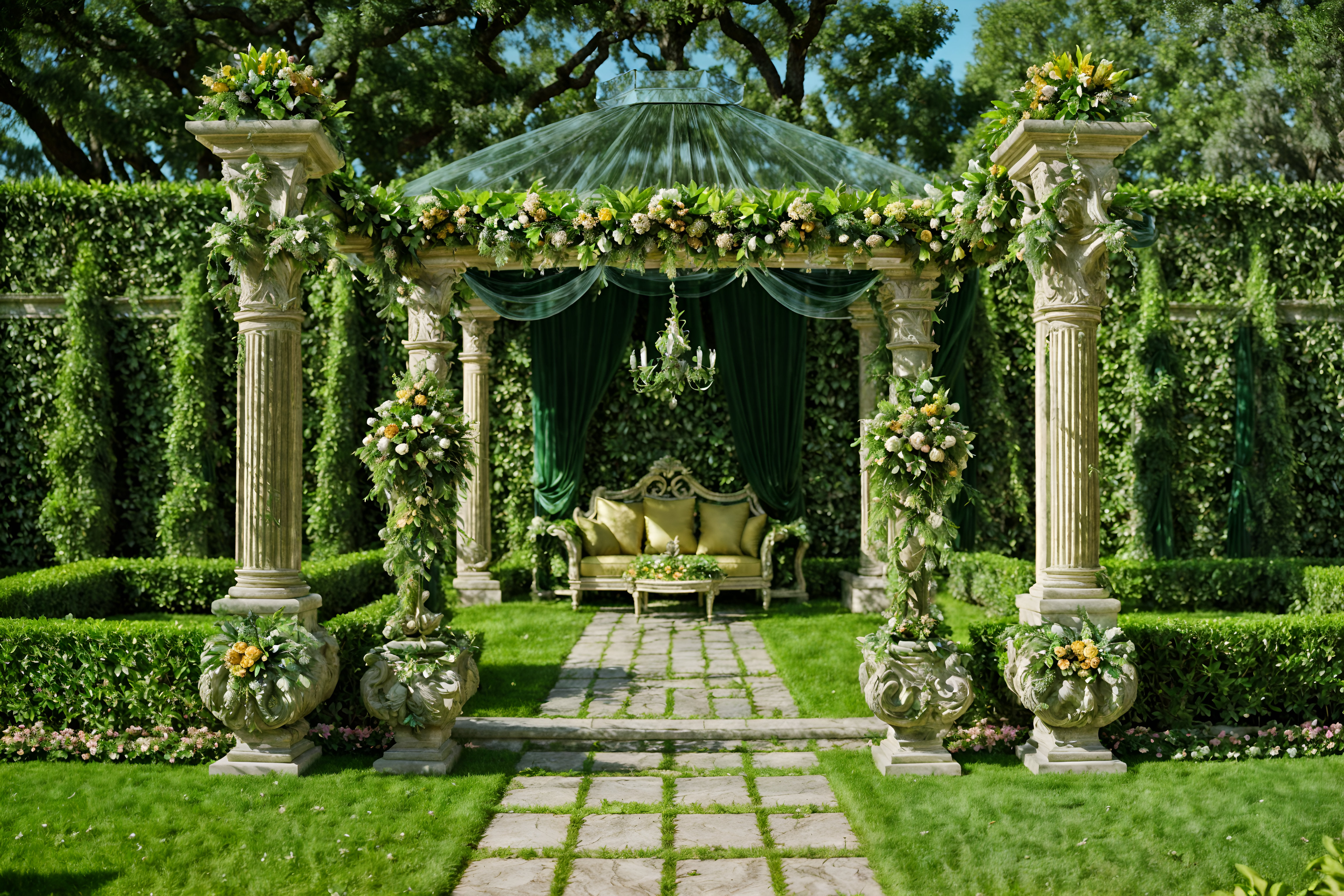 baroque outdoor gardensinterior decorate this outdoor garden with baroque style. . . with grass and garden plants and garden tree and grass. . with movement and pedestal feet and expensive and plush flooring and twisted columns and opulent and colossal furniture and crystal and glass accents and dynamism and luxurious floral and damask fabrics. . .